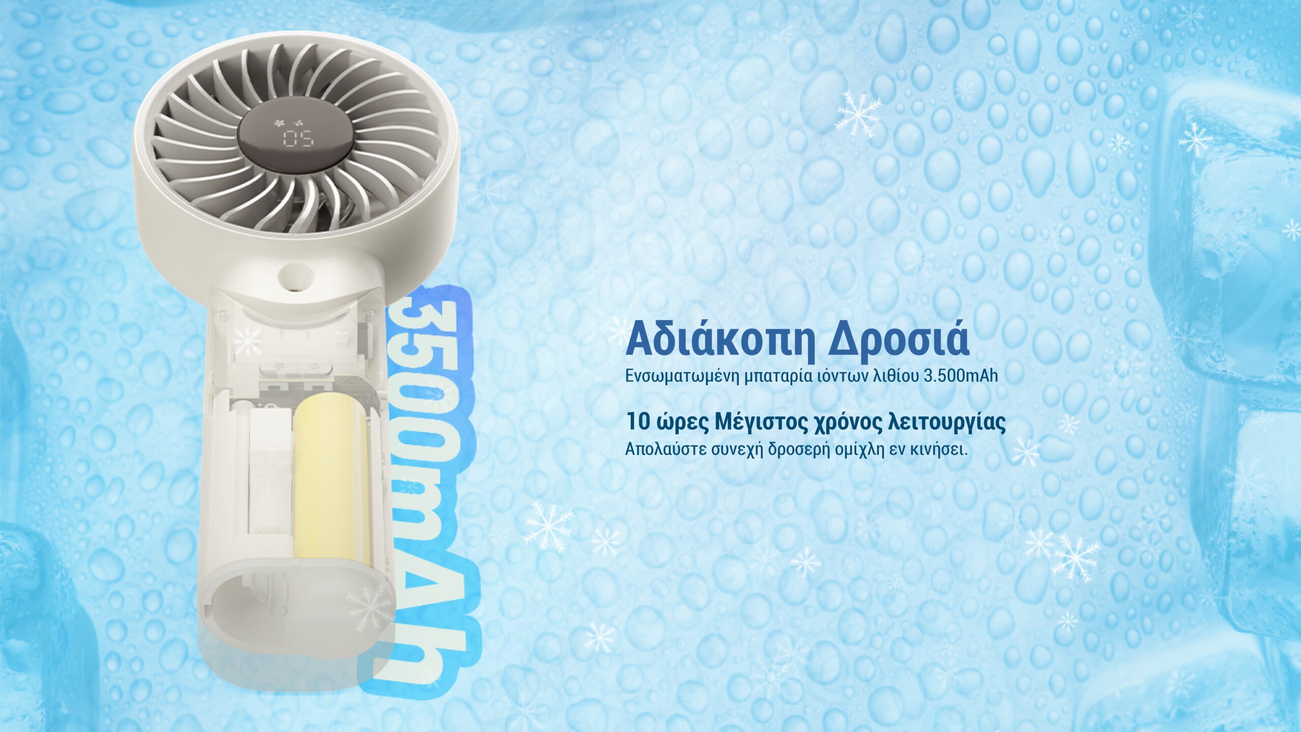 Με μέγιστο χρόνο λειτουργίας έως και 10 ώρες, προσφέρει απολαυστική ψύξη μεγάλης διάρκειας, ενώ διαθέτει μία ενσωματωμένη επαναφορτιζόμενη μπαταρία ιόντων λιθίου 3.500 mAh και η φόρτιση του γίνεται εύκολα μέσω θύρας Type-C (δεν περιλαμβάνεται καλώδιο). Επιπλέον, μπορείτε να το χρησιμοποιείτε ακόμη και κατά τη φόρτιση, για να μην αγχώνεστε για τη μπαταρία.