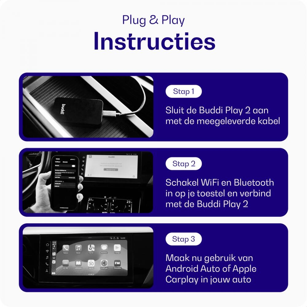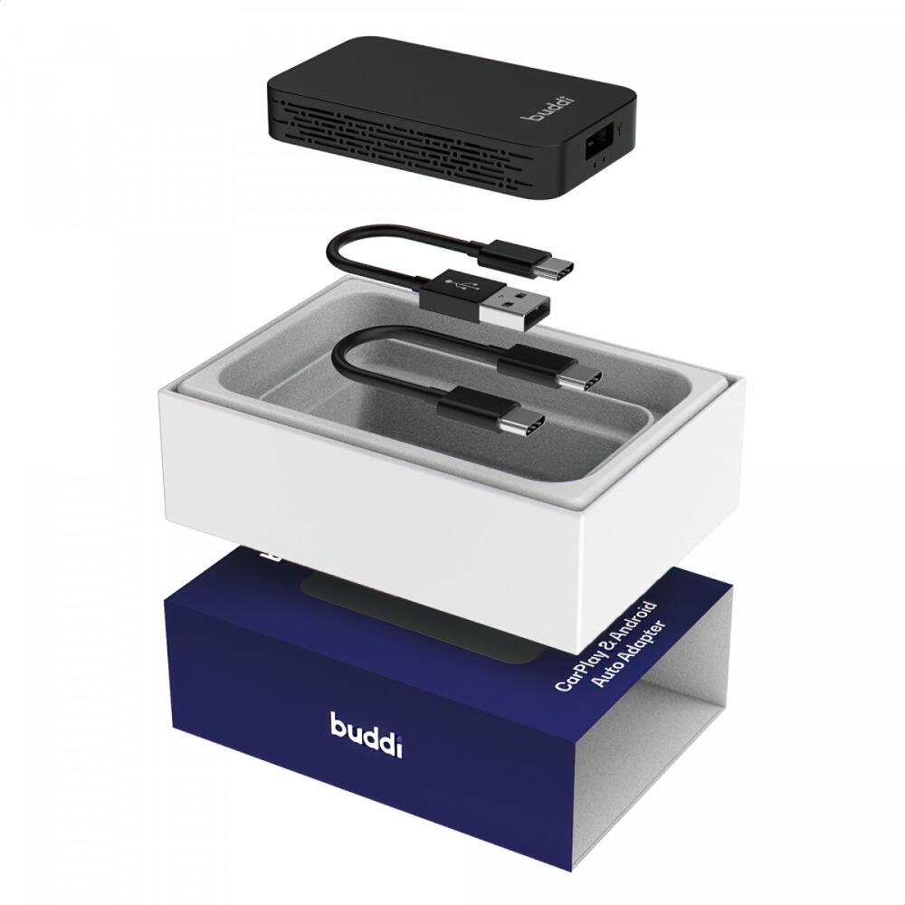 Η εγκατάστασή του είναι πολύ απλή, εσείς απλώς συνδέστε το παρεχόμενο καλώδιο USB-A σε Type-C ή Type-C σε Type-C στον προσαρμογέα και στη συνέχεια, συνδέστε το στη θύρα USB-A ή Type-C του αυτοκινήτου σας. Ενεργοποιήστε το Bluetooth και το WiFi στο τηλέφωνό σας. Συνδέστε το τηλέφωνό σας στο Buddi Play 2 μέσω Bluetooth και WiFi και ο προσαρμογέας είναι πλεόν συνδεδεμένος στο Apple Carplay ή στο Android Auto και μπορέιτε να ξεκινήστε την αναπαραγωγή ήχου, τις κλήσεις και άλλα.