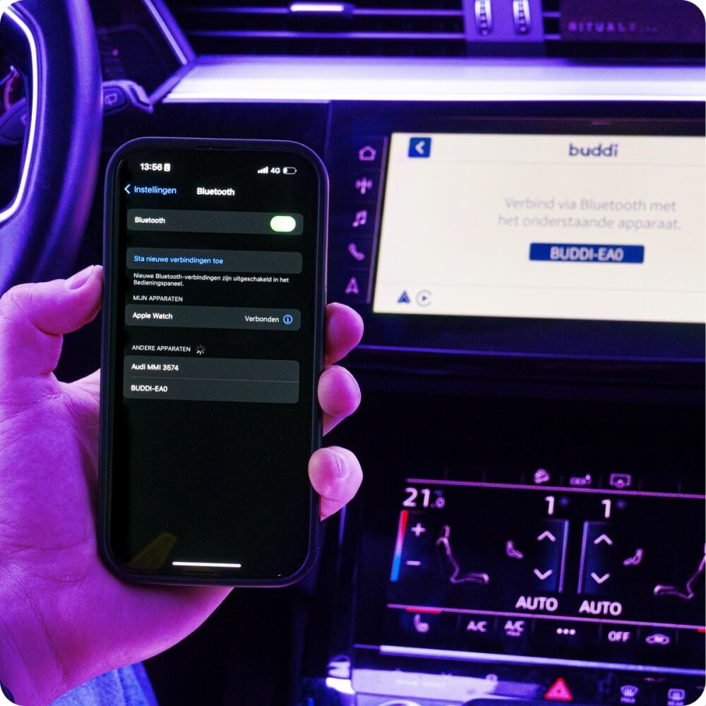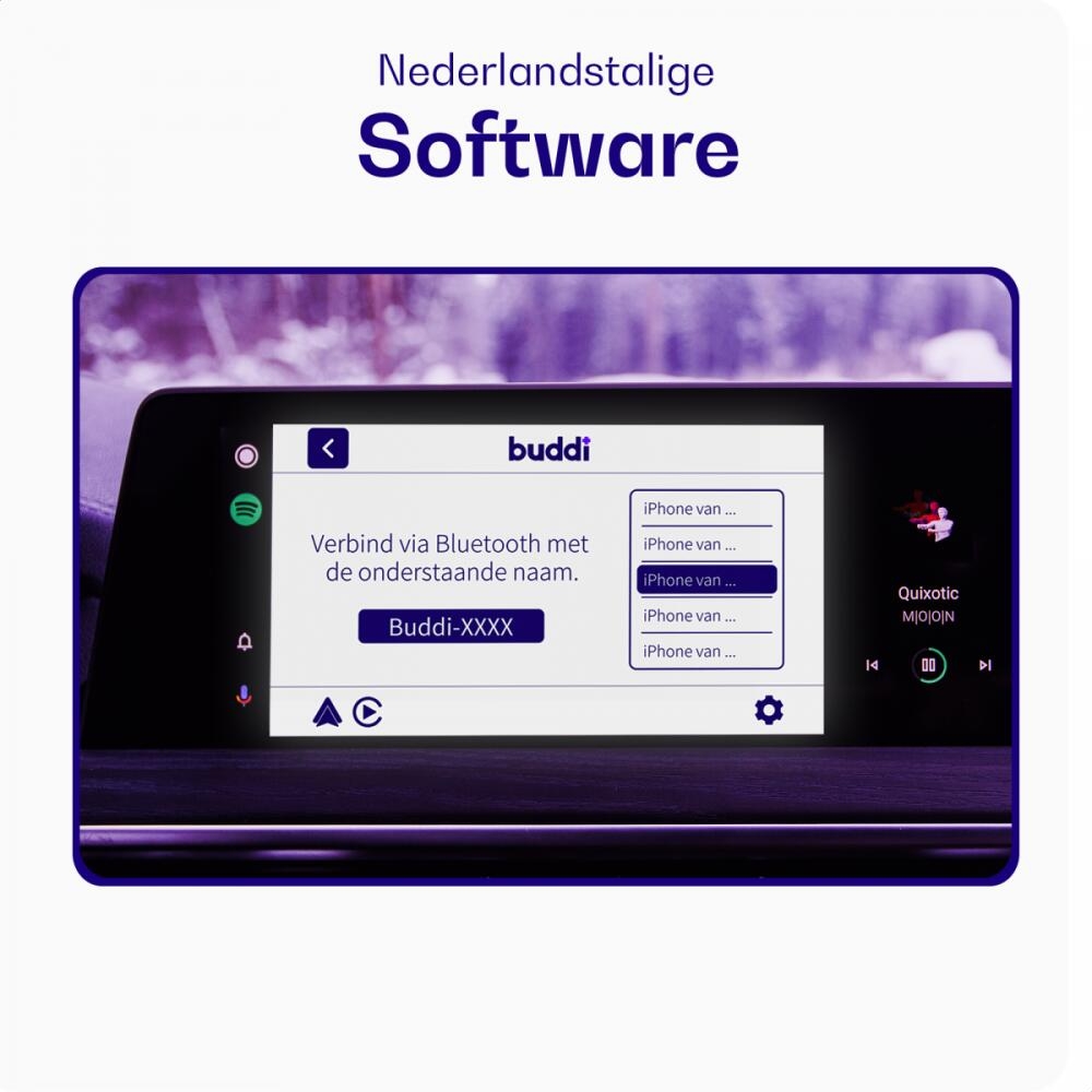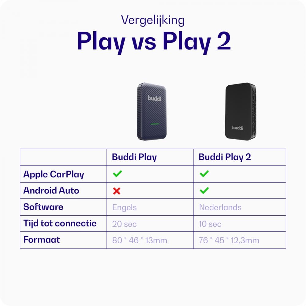 Σημείωση: Το αυτοκίνητό σας πρέπει να διαθέτει ενσωματωμένο σύστημα Apple Carplay ή Android Auto με υποστήριξη για ενσύρματο Carplay, δηλαδή ένα σύστημα που λειτουργεί μόνο εάν συνδέσετε το τηλέφωνό σας ενσύρματα. Κατάλληλο μόνο για μοντέλα από iPhone 6 και νεότερα, με εγκατεστημένο τουλάχιστον iOS 10 ή νεότερο και Android 11.0 και νεότερη έκδοση. Η πρώτη σύνδεση μπορεί να διαρκέσει λίγο περισσότερο χρόνο. Ενεργοποιήστε το WiFi και απενεργοποιήστε το VPN σας (αν χρησιμοποιείτε) όταν θέλετε να συνδεθείτε στο Buddi Play 2.