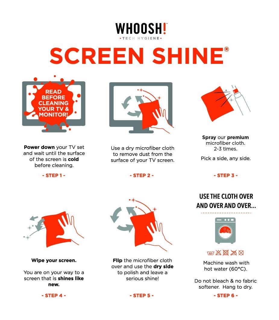 Χρησιμοποιώντας συνδυαστικά το Screen Shine υγρό με το εξαιρετικά μαλακό πανί μικροϊνών, το οποίο διαθέτει αντιμικροβιακή δράση, θα καθαρίσετε τις συσκευές σας κάνοντάς τις να λάμπουν και να φαίνονται σαν καινούργιες. Είναι το καλύτερο υγρό καθαρισμού που έχει σχεδιαστεί για οθόνες αφής. Είναι 100% φυσικό και δεν έχει δοκιμαστεί ποτέ σε ζώα.