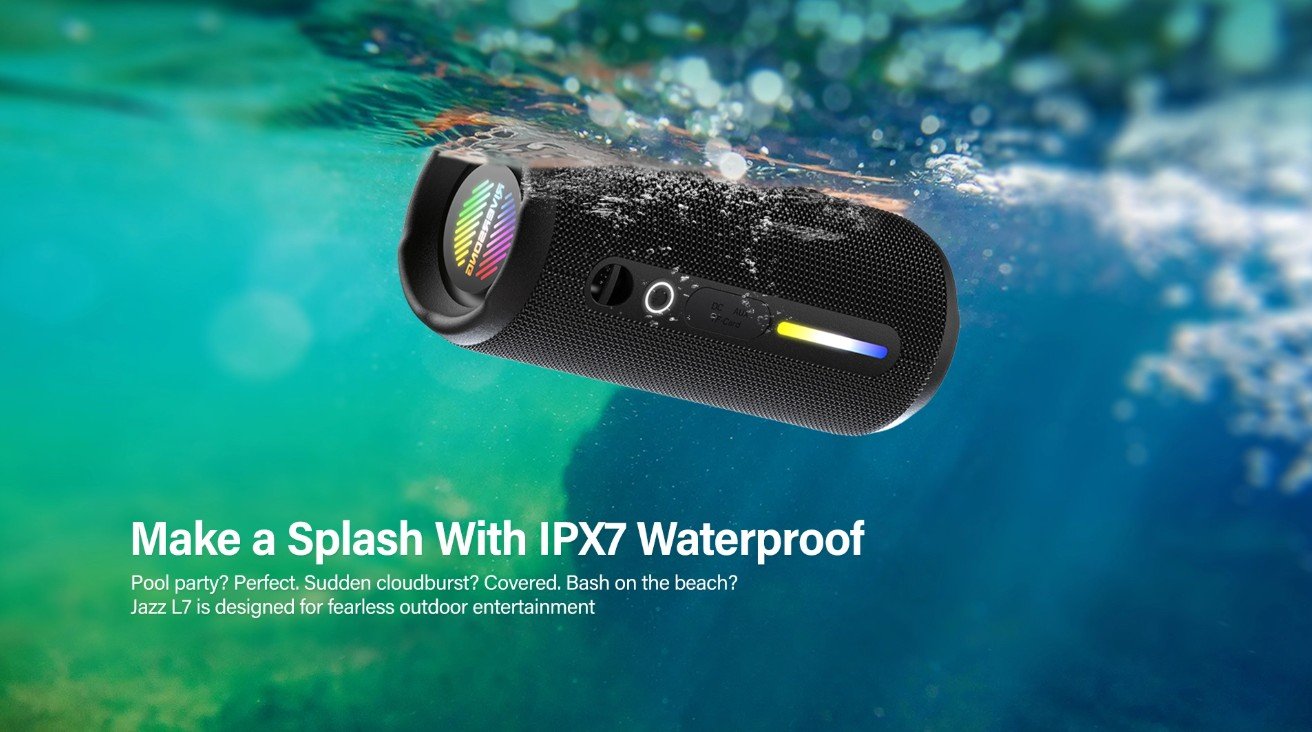Η βροχή, τα κύματα της θάλασσας ή οι πιτσιλιές από την πισίνα δεν αποτελούν πλέον πρόβλημα, χάρη στην πιστοποίηση IPX7, έτσι, το Jazz L7 είναι ιδανικό για εξωτερικούς χώρους. Βυθίστε το άφοβα ή πάρτε το μαζί στην παραλία! Επιπλέον, μπορείτε να συνδέσετε δύο Jazz L7 μεταξύ τους για έναν πραγματικό στερεοφωνικό ήχο και να αυξήσετε τη μουσική σας απόλαυση.