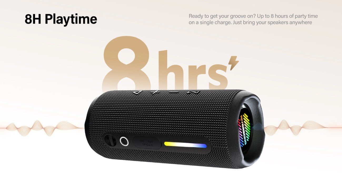 Με μία μόνο φόρτιση, απολαμβάνετε έως και 8 ώρες non-stop μουσικής. Επίσης, είναι ιδανικό για μεγαλύτερους χώρους, όπως πάρτι! Τέλος, είναι ελαφρύ και φορητό ώστε να το έχετε μαζί σας όπου και αν βρίσκεστε και να γεμίζετε κάθε χώρο με μουσική!