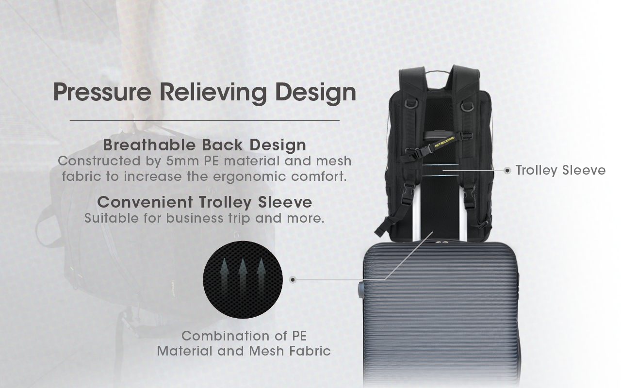 Η πλάτη έχει σχεδιαστεί ώστε να αναπνέει και είναι κατασκευασμένη από υλικό PE 5mm και διχτυωτό ύφασμα ώστε η άνεση και η εργονομία να είναι βελτιωμένες, ενώ διαθέτει βολικά "μανίκια" για την προσάρτηση του σάκου σε χειρολαβή βαλίτσας, προσφέρει πολύ βολική προσάρτηση για την μετακίνηση στα επαγγελματικά ταξίδια και όχι μόνο.