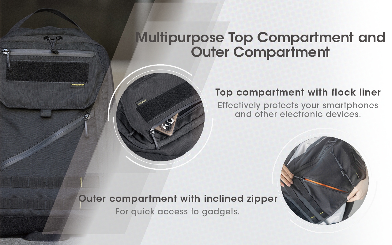 Το επάνω διαμέρισμα διαθέτει μαλακή επένδυση έτσι ώστε να προστατεύει αποτελεσματικά το κινητό σας τηλέφωνο και άλλες ηλεκτρονικές συσκευές, ενώ η εξωτερική θήκη με το διαγώνιο φερμουάρ επιτρέπει την γρήγορη πρόσβαση στα απαραίτητα αξεσουάρ. Εσωτερικά διαθέτει επένδυση σε χρώμα πορτοκαλί υψηλής ορατότητας, μία ειδική σχεδίαση για αναγνώριση σε συνθήκες χαμηλού φωτισμού.