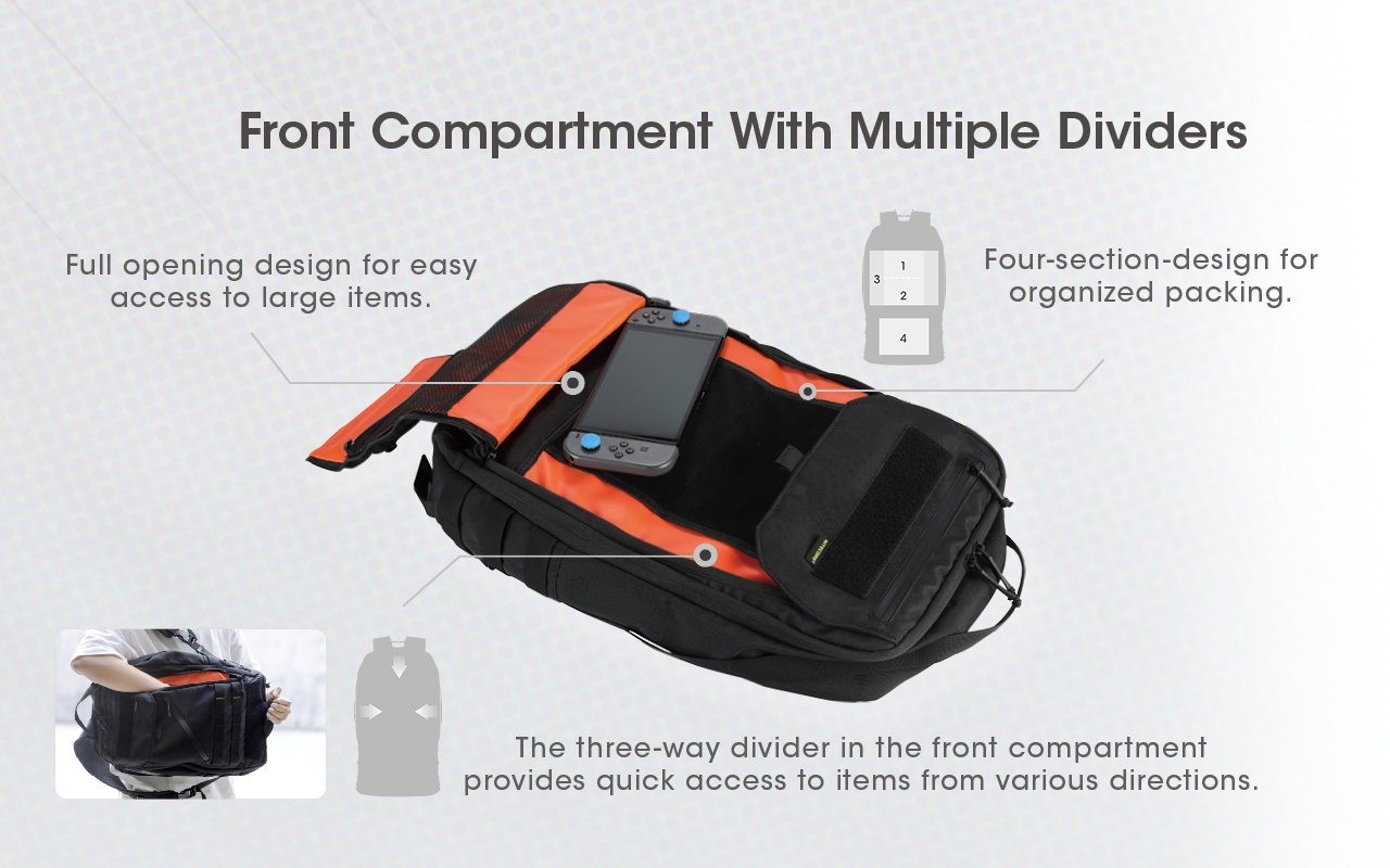 Στο μπροστινό μέρος, διαθέτει μία θήκη με διχτυωτό ύφασμα ιδανική για αποθήκευση διαβατηρίων και άλλων αντικειμένων, ενώ οι δύο θήκες στα πλαϊνά είναι ιδανικές για αποθήκευση μπουκαλιών, ομπρελών, PowerBank και άλλων. Η εμπρόσθια θήκη διαθέτει πολλούς διαχωριστές, με σχεδιασμό πλήρους ανοίγματος για πρόσβαση σε μεγάλα αντικείμενα, σχεδιασμό τεσσάρων τομέων για την ταξινόμηση των αντικειμένων και με διαχωριστή τριών τμημάτων ο οποίος επιτρέπει την πρόσβαση των αντικειμένων από πολλές κατευθύνσεις.