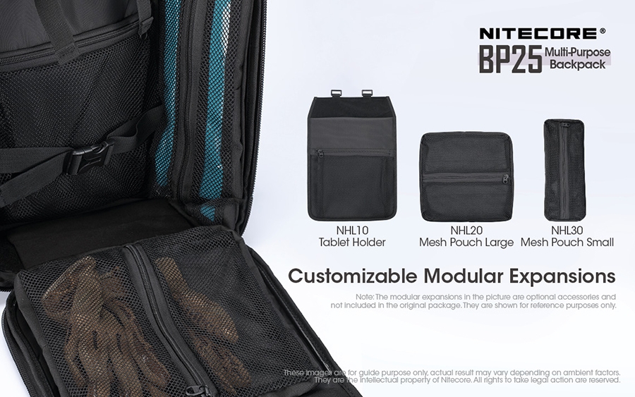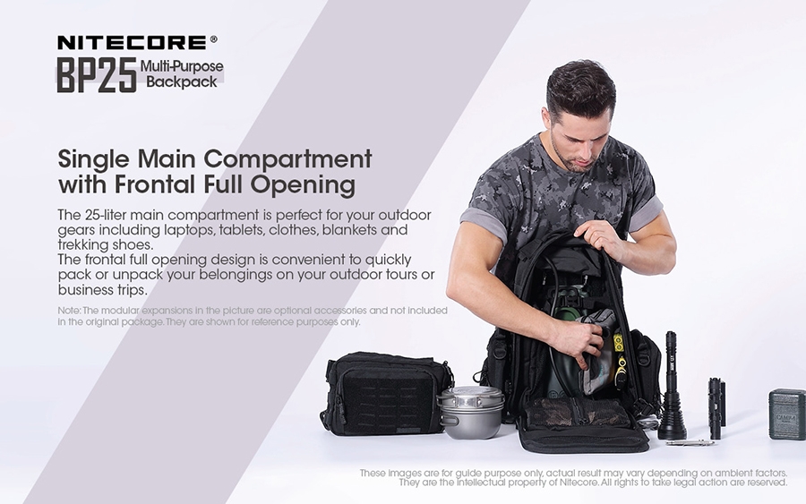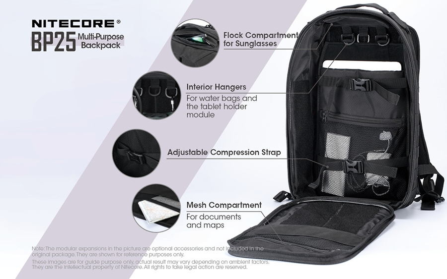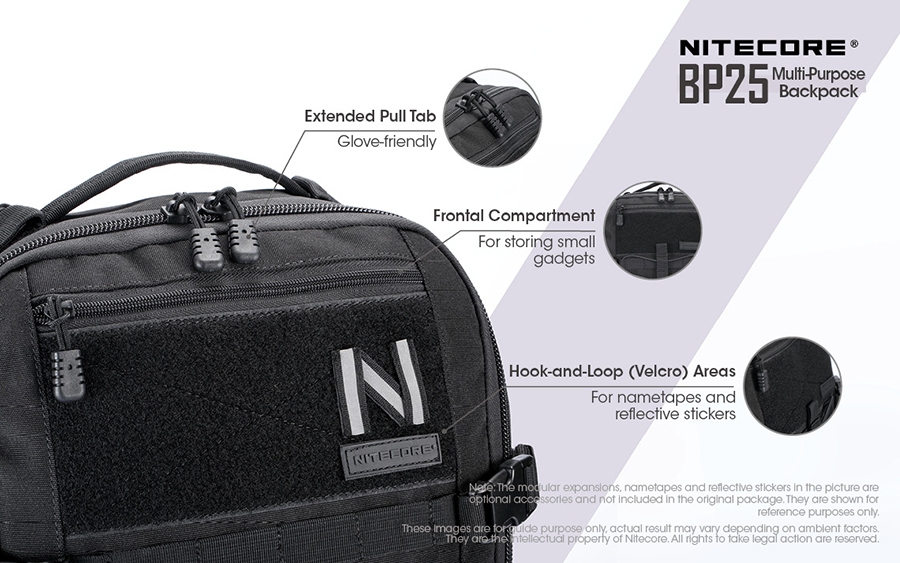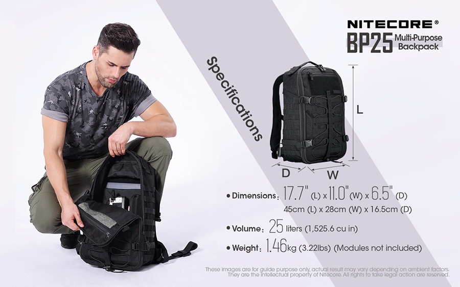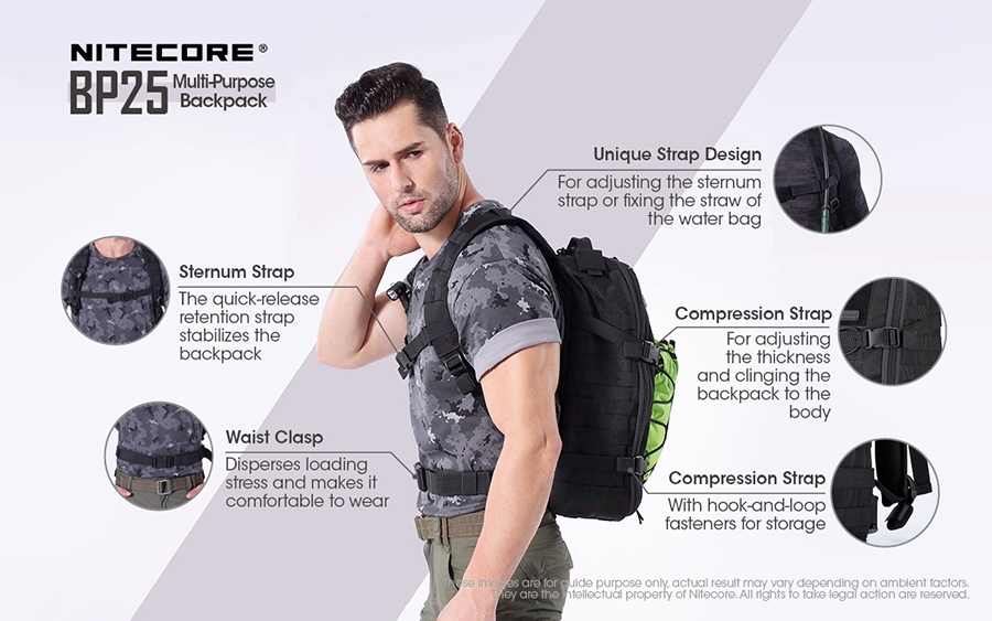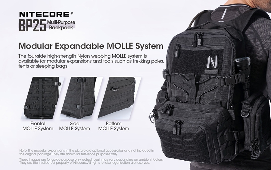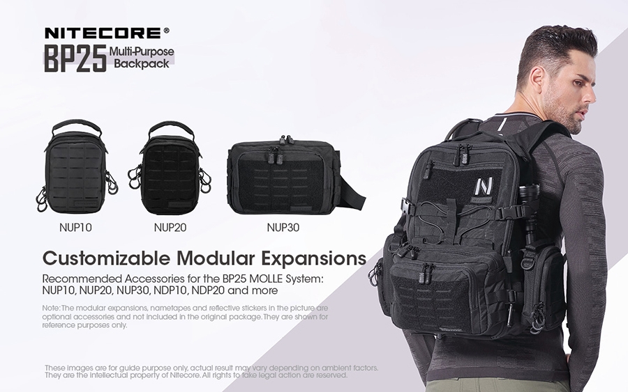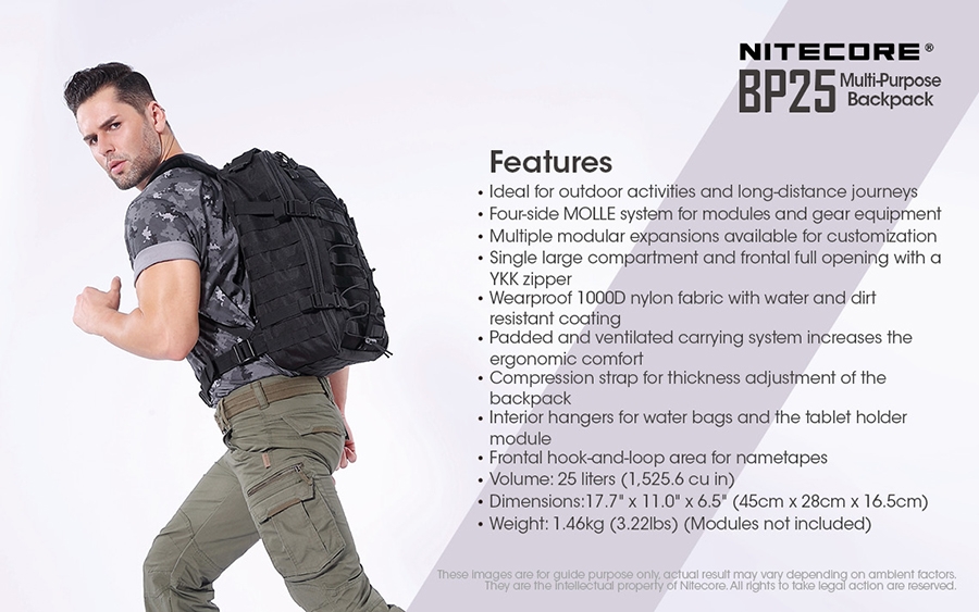 Το σακίδιο πλάτης BP25 Backpack 25 λίτρων της Nitecore, αποτελεί την καλύτερη επιλογή για τις εξορμήσεις σας. Είναι ένα πολύ-χρηστικό σακίδιο πλάτης με σύστημα ανάρτησης και επέκτασης MOLLE και σας επιτρέπει την προσαρμογή διαφόρων επεκτάσεων και εργαλείων ανάλογα με την δραστηριότητα που έχετε επιλέξει.