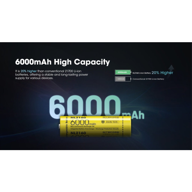 Η νέας γενιάς επαναφορτιζόμενη μπαταρία Li-ion NL2160 της Nitecore προσφέρει μία εξαιρετική λύση για του χρήστες που απαιτούν μέγιστη απόδοση και αξιοπιστία. Με εντυπωσιακή χωρητικότητα 6000mAh και ρεύμα συνεχούς αποφόρτισης 8Α, η μπαταρία αυτή παρέχει 20% μεγαλύτερη χωρητικότητα σε σχέση με τις κοινές μπαταρίες τύπου Li-ion 21700, εξασφαλίζοντας παρατεταμένη και σταθερή παροχή ενέργειας για μια ευρεία γκάμα συσκευών.