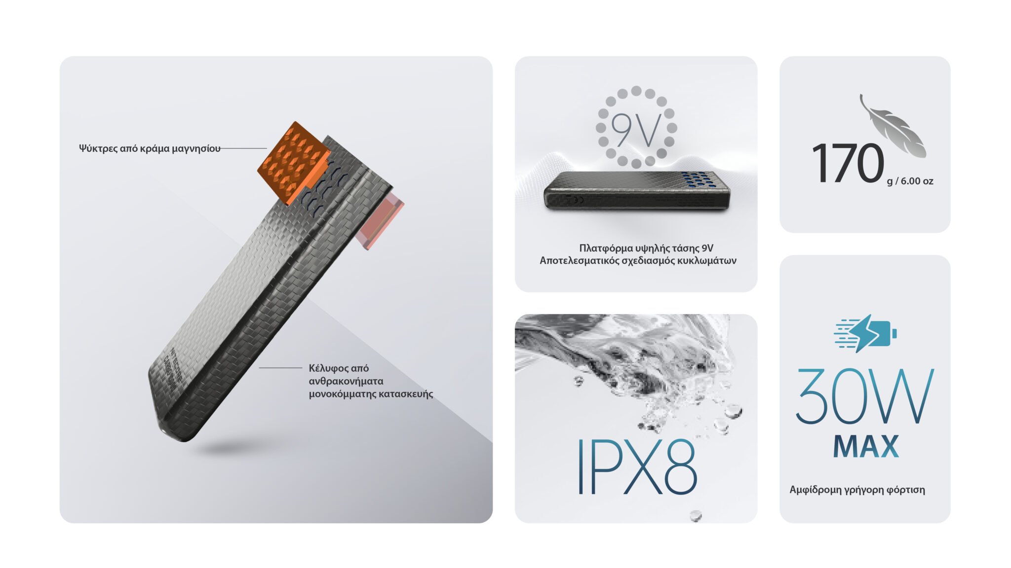 Προσφέρει υψηλής ποιότητας απόδοση με νέα πλατφόρμα υψηλής τάσης 9V και τεχνολογία ενεργής εξισορρόπησης BMS. Χάρη στην αμφίδρομη γρήγορη φόρτιση 30W, μπορείτε να φορτίσετε το PowerBank αλλά και την συσκευή σας ταυτόχρονα. Επίσης, είναι σχεδιασμένο με δύο θύρες Type-C (IN/OUT 30W) με υποστήριξη πολλαπλών πρωτοκόλλων, PD, QC 3.0, SCP.