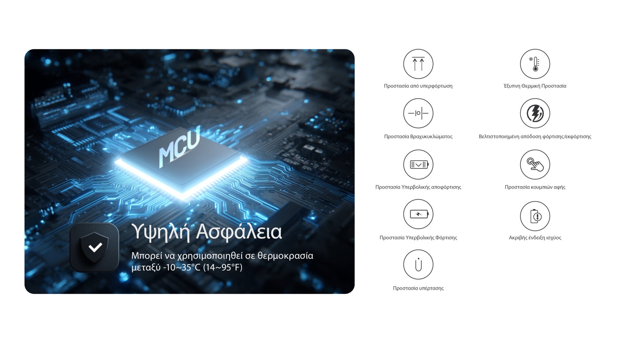Σχεδιασμένο με πολλαπλή αδιάβροχη προστασία, εσωτερικά και εξωτερικά και με πλήκτρο αφής (Touch Button) για καλύτερη ασφάλεια. Σας προσφέρει αξιοπιστία και ασφάλεια, με το ενσωματωμένο MCU και τα διπλά θερμίστορ NTP για συνεχή παρακολούθηση θερμοκρασίας, ενώ έχει προστασία από υπερφόρτιση, υπέρταση, βραχυκύκλωμα, υπερθέρμανση και άλλα.
