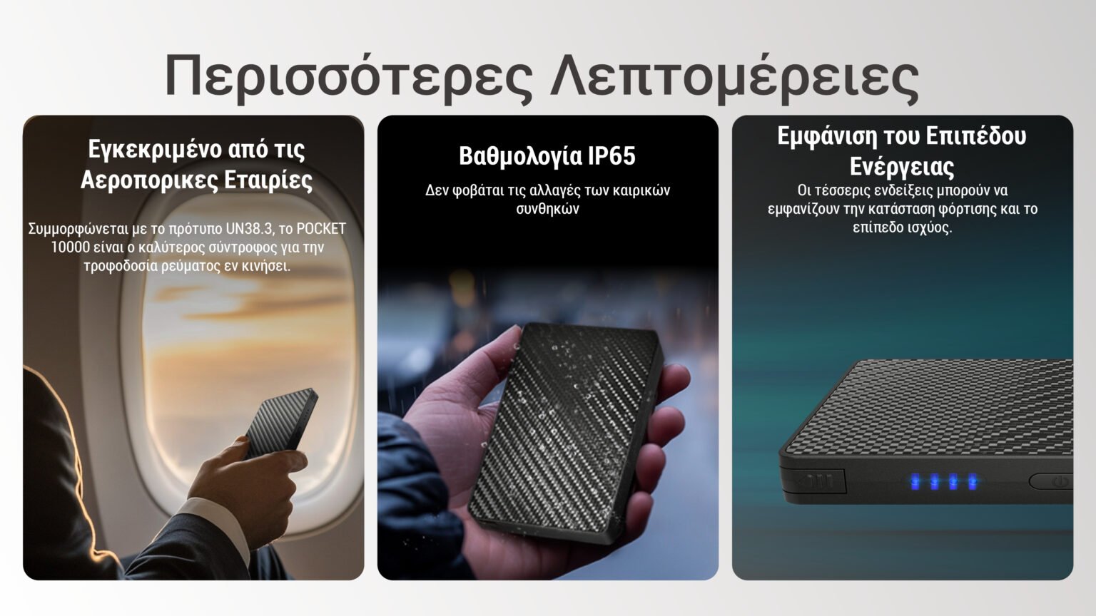 Επίσης, είναι εγκεκριμένο από τις αεροπορικές εταιρείες και πλήρως συμμορφωμένο με το πρότυπο UN38.3, ώστε να το έχετε παντού μαζί σας, ακόμη και στα αεροπορικά σας ταξίδια! Με βαθμό προστασίας IP65, δεν επηρεάζεται από τη βροχή, τη σκόνη ή τις απρόβλεπτες καιρικές συνθήκες. Τέλος, οι τέσσερις ενδεικτικές λυχνίες δείχνουν ανά πάσα στιγμή το επίπεδο ισχύος και την κατάσταση φόρτισης.