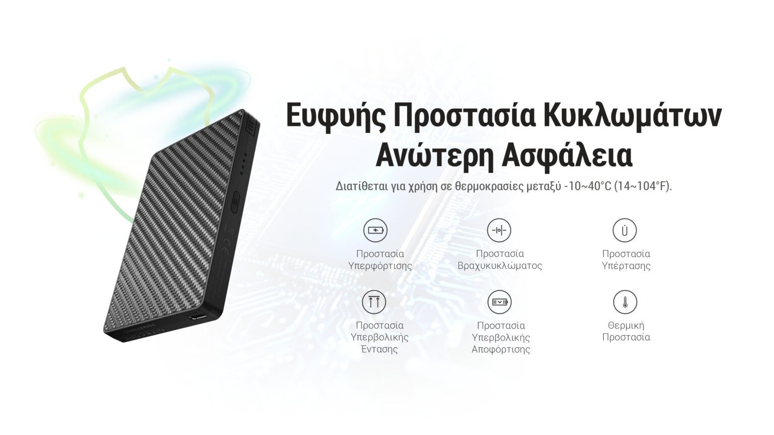 Προσφέρει ευρεία συμβατότητα με συσκευές Android και iOS και είναι ιδανικό για τη φόρτιση πολλών ηλεκτρονικών συσκευών, ενώ σας εξασφαλίζει την φόρτιση μέσω της αμφίδρομης γρήγορης φόρτισης PD. Η ισχυρή έξοδος των 20W και η είσοδος των 18W προσφέρουν εντυπωσιακή απόδοση, ενώ η θύρα Type-C 22,5W ενσωματώνει δυνατότητες τόσο για έξοδο όσο και για είσοδο.