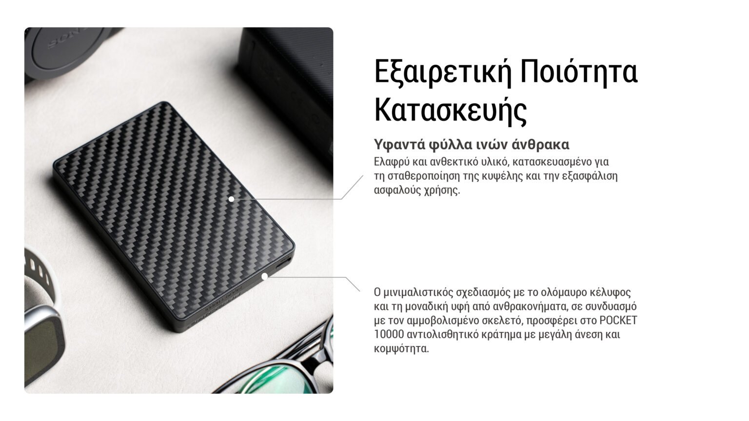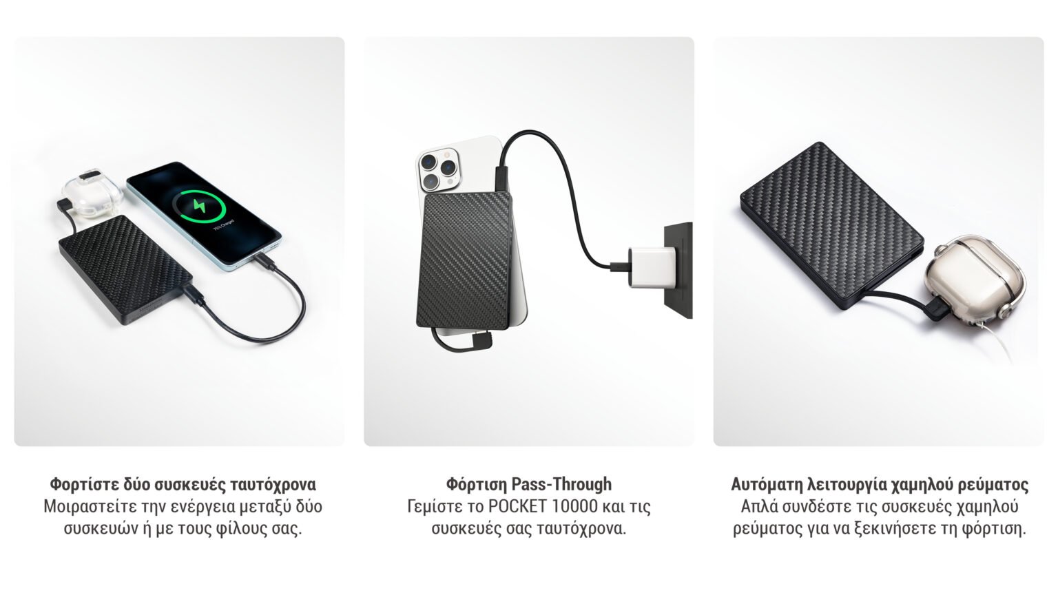 Η λειτουργία Pass-Through Charging σας επιτρέπει να φορτίζετε ταυτόχρονα τόσο το ίδιο το Pocket 10000 όσο και τις συνδεδεμένες συσκευές σας. Επιπλέον, με την αυτόματη λειτουργία χαμηλού ρεύματος, το Pocket 10000 αναγνωρίζει και ενεργοποιεί αυτόματα τη σωστή ροή ενέργειας για μικρές συσκευές όπως ακουστικά, smartwatches ή fitness trackers.