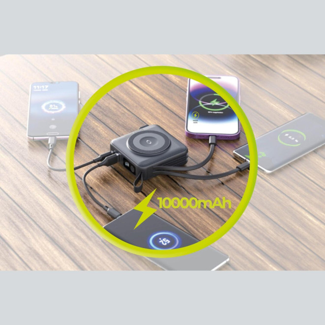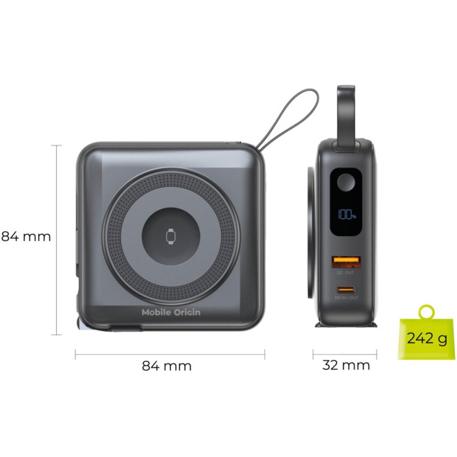 Το πολυλειτουργικό και πρακτικό PowerBank με χωρητικότητα 10.000 mAh της Mobile Origin, διαθέτει ασύρματη φόρτιση MagSafe 15W για iPhone ή 2.5W για Apple Wach, ενσωματωμένα καλώδια εξόδου Type-C, Lightning, και θύρες USB-A 22,5W και Type-C 20W. Προσφέρει γρήγορη φόρτιση και μπορεί να φορτίσει τις αγαπημένες σας συσκευές όπως smartphone, Apple Watch, tablet και φορητούς υπολογιστές.