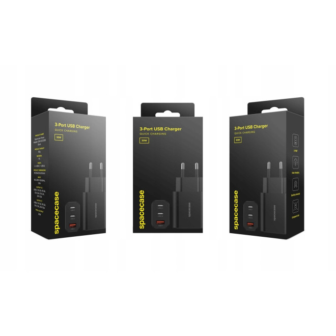 Ανακαλύψτε την απόλυτη εμπειρία φόρτισης με τον φορτιστή SC003B 3-Port Quick USB Charger της Spacecase. Αυτός ο γρήγορος και ασφαλής φορτιστής είναι εξοπλισμένος με μία θύρα USB-A και δύο θύρες Type-C, επιτρέποντάς σας να φορτίζετε πολλαπλές συσκευές ταυτόχρονα.