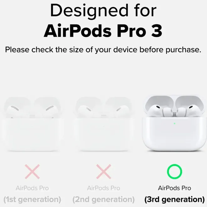 Η θήκη είναι συμβατή μόνο με τα AirPods Pro 3rd Gen και όχι με τα AirPods 4th Gen, Airpods Pro 2nd Gen, Airpods 3rd Gen, AirPods 2nd Gen / 1st Gen ή τα AirPods Pro 1st Gen.