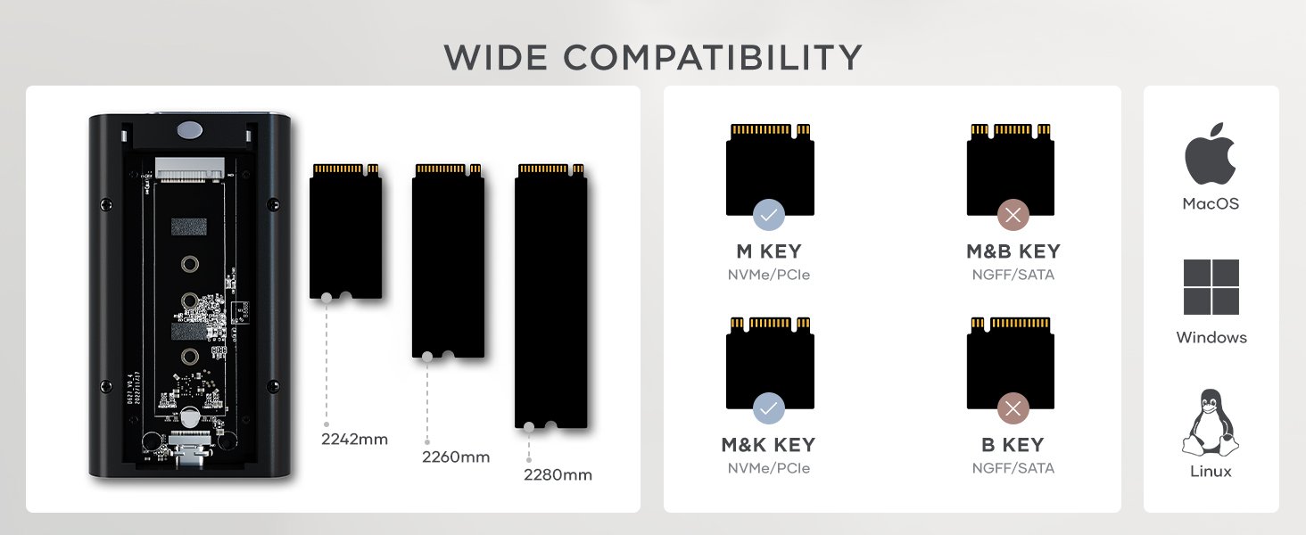 Σημείωση: Δεν περιλαμβάνεται εξωτερικός σκληρός δίσκος. Απαιτούνται θύρες Thunderbolt 4, Thunderbolt 3 και USB4 Type-C για την καλύτερη χρήση. Η πραγματική ταχύτητα μεταφοράς εξαρτάται από την ταχύτητα USB4 ή Thubolnder0 για SSD τελική απόδοση ταχύτητας. Οι διεπαφές USB 3.1 Gen1 και USB 3.0 υποστηρίζουν έως και 5 Gbps. Υποστηρίζει μονάδες M.2 NVMe, μεγέθη: 2280/2260/2242 mm, έως 16 TB, PCI-E Gen 4x4, με μέγιστο εύρος ζώνης 8 GB/s. Επιτυγχάνει πραγματικές ταχύτητες ανάγνωσης/εγγραφής έως και 3840 MB/s, καθιστώντας το ιδανική λύση για επέκταση αποθηκευτικού χώρου, αναβάθμιση συστήματος, δημιουργία αντιγράφων ασφαλείας, ανάκτηση και μεταφορά δεδομένων.
