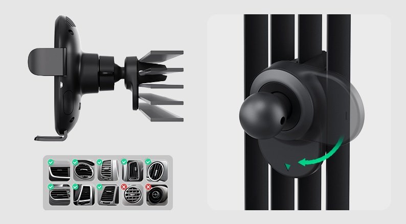 Χάρη στο ασφαλές κλιπ για την τοποθέτηση στους αεραγωγούς του αυτοκινήτου σας, η βάση είναι κατάλληλη για οριζόντιες ή κάθετες γρίλιες στους αεραγωγούς και σας εξασφαλίζει ένα σταθερό κράτημα και αποτρέπει κάθε μετακίνηση ή πτώση, ακόμα και στους πιο ανώμαλους δρόμους!