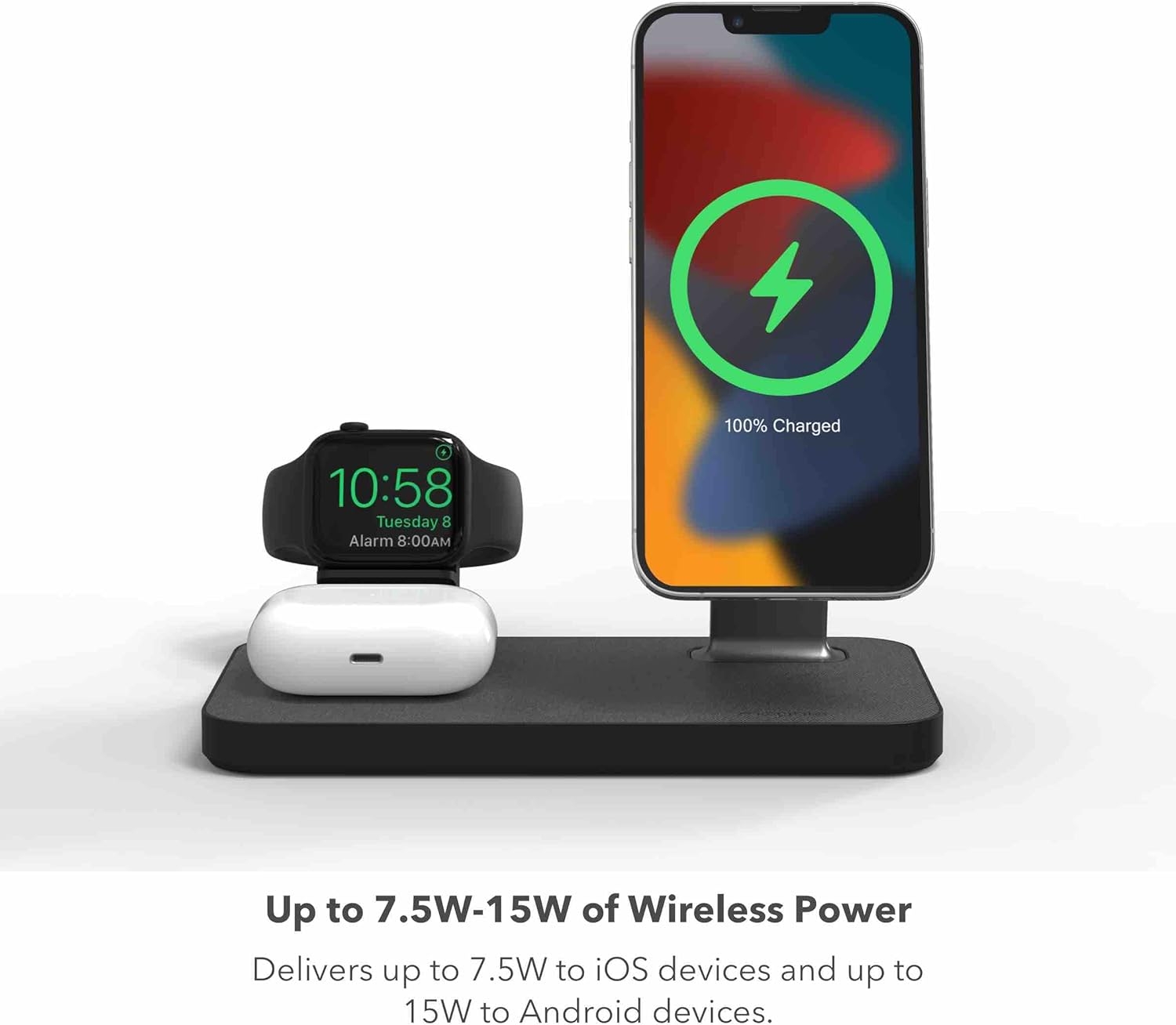 Εκτός από τη φόρτιση του iPhone σας, ο ασύρματος φορτιστής διαθέτει και ένα σημείο φόρτισης που παρέχει έως και 5W στα AirPods σας. Διαθέτει επίσης αντάπτορα δύο σημείων, που μπορούν να φιλοξενήσουν φορτιστές για το Apple και το Galaxy Smartwatch σας.