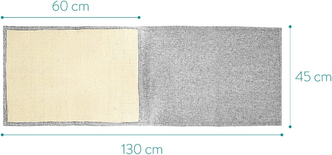 Το μισό είναι καλυμμένο με σιζάλ και το άλλο μισό είναι από ύφασμα, το οποίο τοποθετείται πάνω στον καναπέ, στον βραχίονα ή στο σημείο που κάθεστε, σε πολυθρόνες ή ακόμα και στο πάτωμα. Η γάτα σας μπορεί πλέον να ακονίσει τα νύχια της και τα έπιπλα σας θα παραμένουν προστατευμένα.