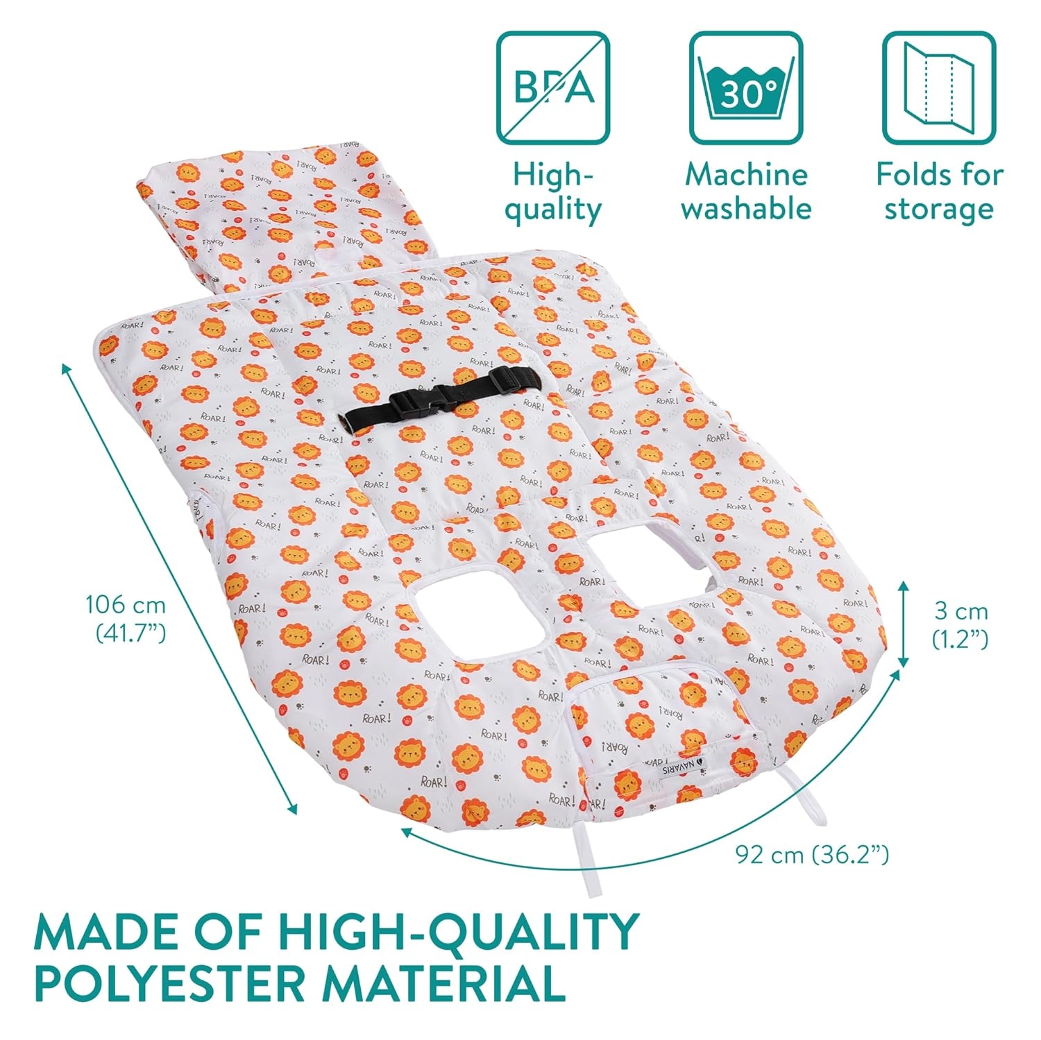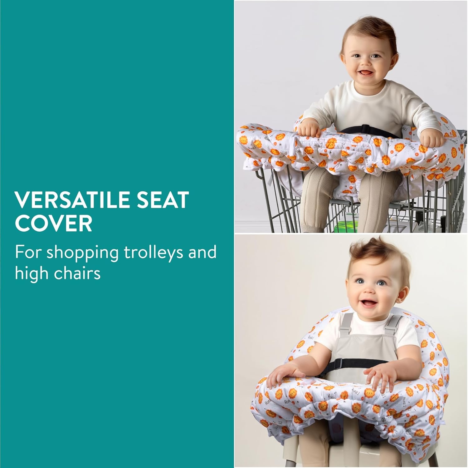 Σχεδιασμένο με γνώμονα την πρακτικότητα και την κομψότητα, το κάλυμμα αυτό εξυπηρετεί διπλή χρήση, δηλαδή καλύπτει τόσο τα καθίσματα στα καρότσια αγορών όσο και τα παιδικά καρεκλάκια, εξασφαλίζοντας καθαρό και άνετο χώρο όπου κι αν βρίσκεστε. Ταυτόχρονα, έχει ένα χαριτωμένο και ελκυστικό σχέδιο, κατάλληλο για αγόρια και κορίτσια.
