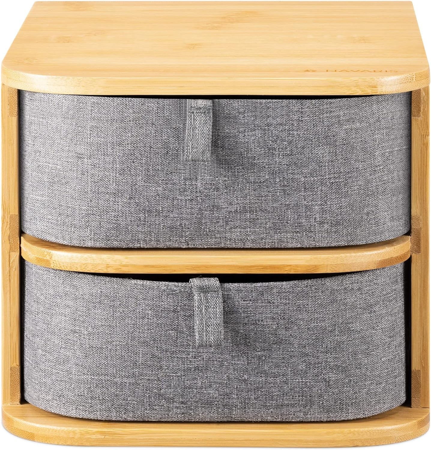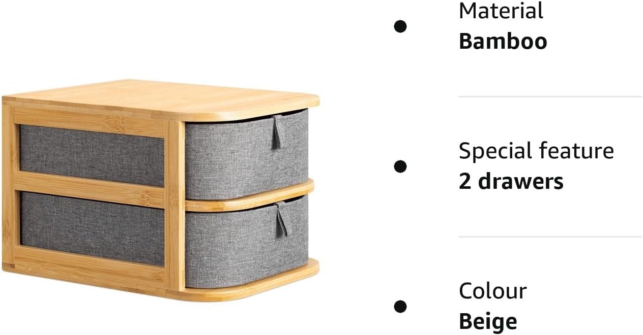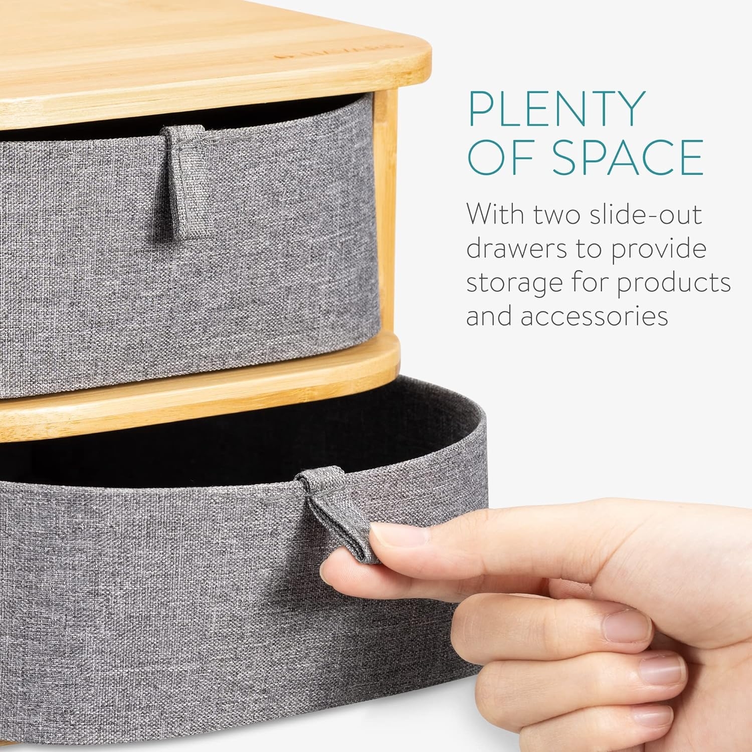 Με τα πρακτικά 2 συρτάρια θα μπορείτε να οργανώστε όλα τα προϊόντα περιποίησής σας, από μακιγιάζ, κρέμες και προϊόντα μαλλιών. Ακόμη και τα μεγαλύτερα αντικείμενα μπορούν να αποθηκευτούν στην επάνω στιβαρή επιφάνεια από μπαμπού, παρέχοντας ένα πρακτικό χώρο για εύκολη πρόσβαση και οργάνωση.