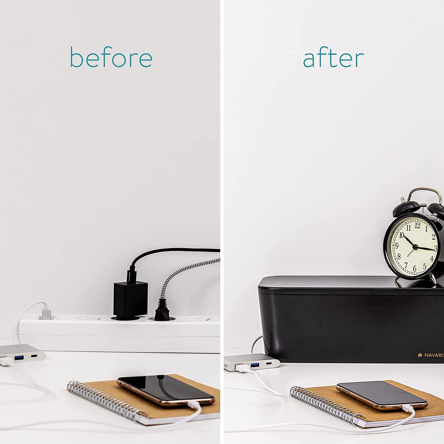 Τοποθετήστε το κουτί οργάνωσης καλωδίων της Navaris στο γραφείο ή οπουδήποτε θέλετε και τοποθετήστε τα καλώδια μέσα στο κουτί, διατηρώντας το χώρο σας σε τάξη. Απλώς περάστε το καλώδιο στην υποδοχή που έχει το κουτί στο πλάι και τοποθετήστε τα τροφοδοτικά μέσα στο κουτί.
