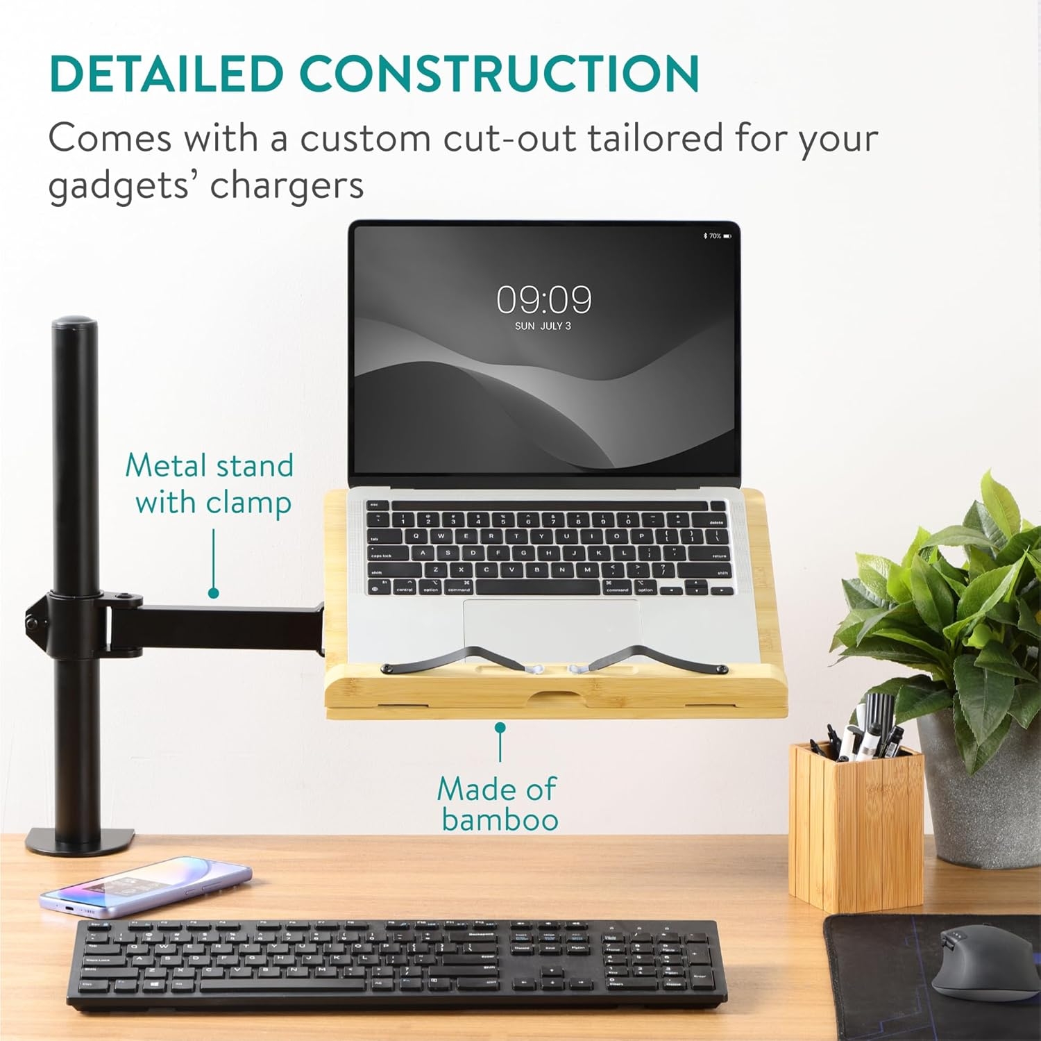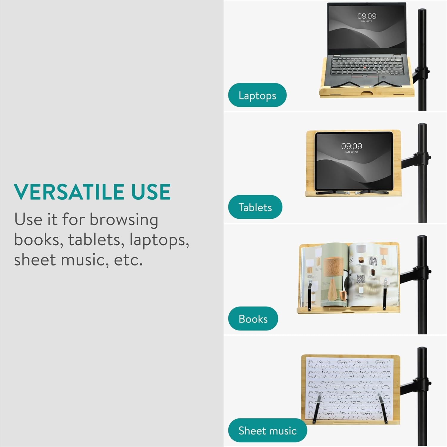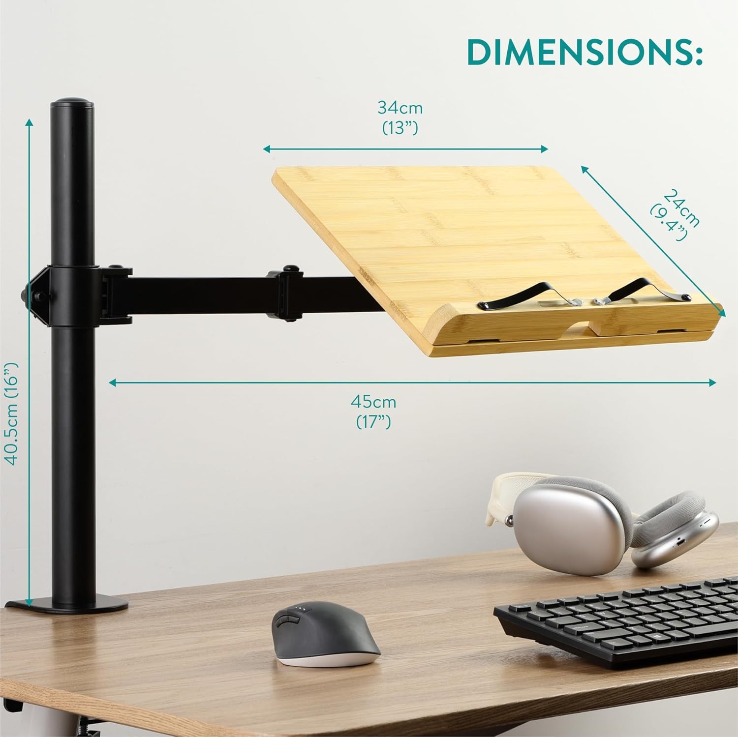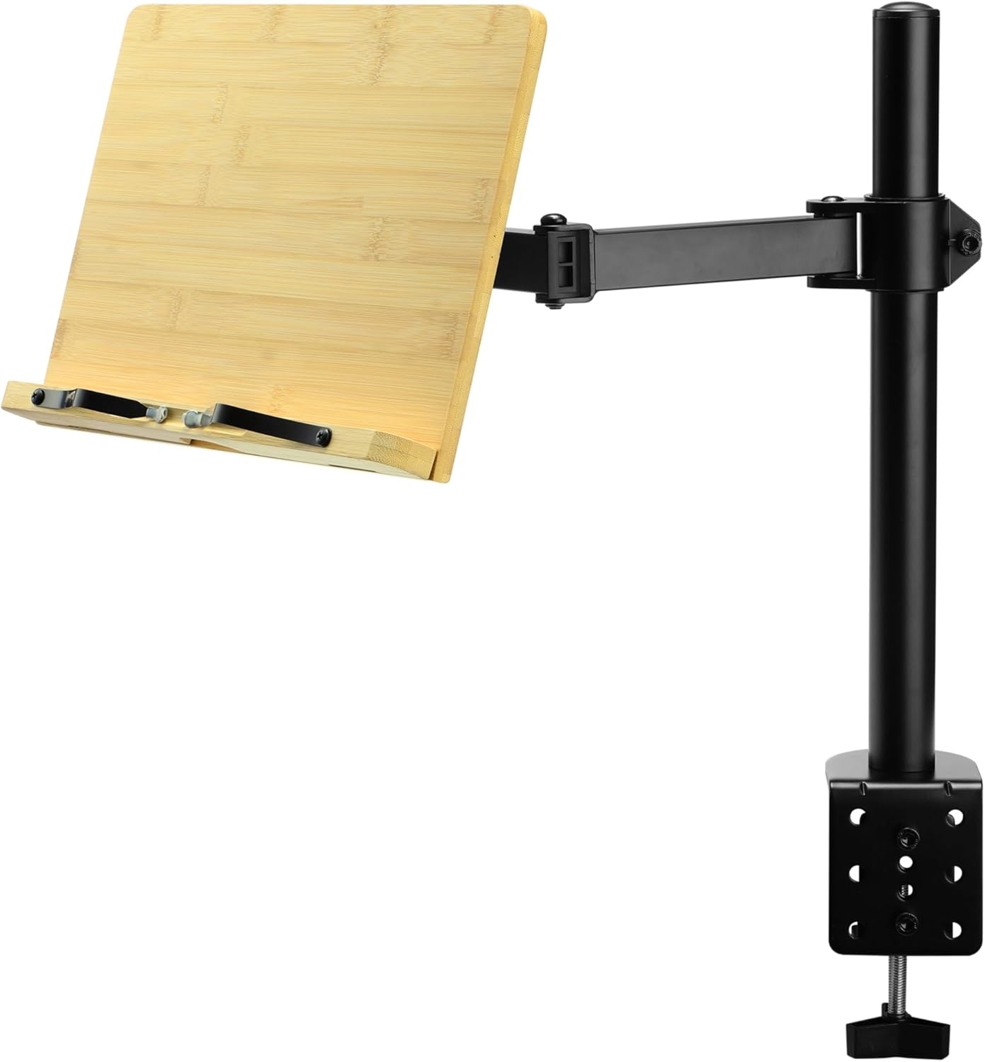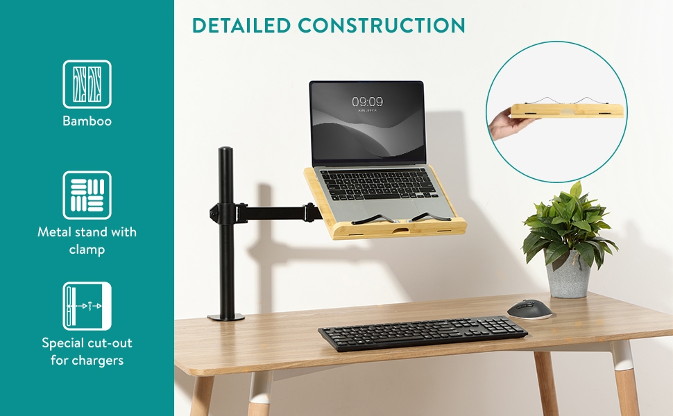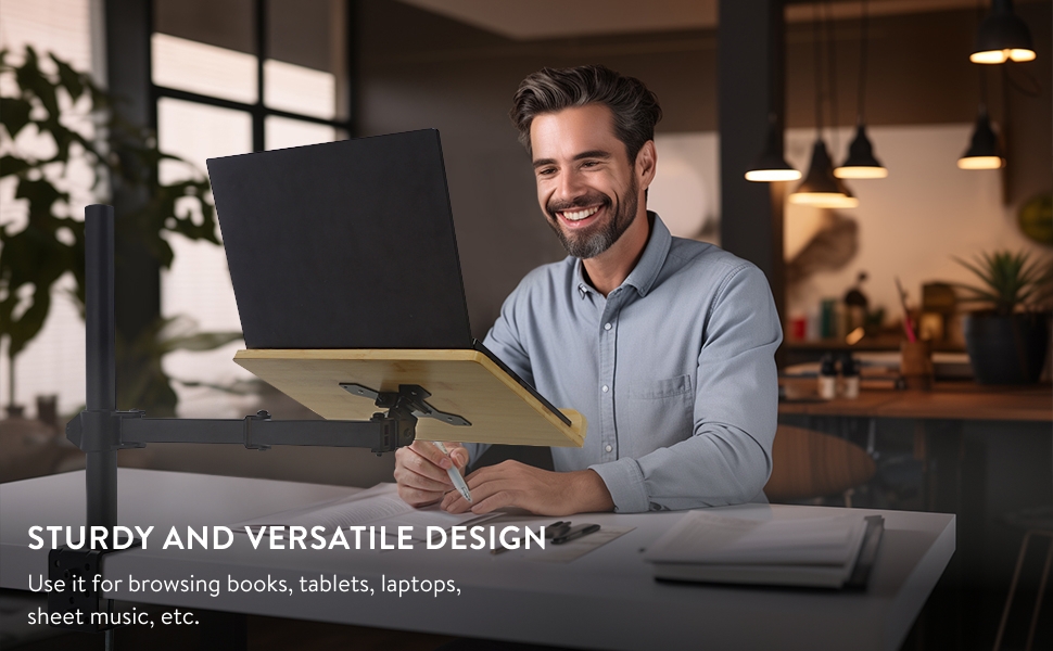 Αυτή η ρυθμιζόμενη βάση προσφέρει άνεση και ευελιξία στις καθημερινές σας δραστηριότητες και συνδέεται με ασφάλεια σε γραφεία ή τραπέζια με πάχος έως 8cm και συγκρατεί με ασφάλεια βαριά βιβλία, tablet κ.α. Η στιβαρή της κατασκευή από μπαμπού διασφαλίζει την ανθεκτικότητα, ενώ ο μεταλλικός της βραχίονας με τον σφιγκτήρα εξασφαλίζει τη σταθερή και ασφαλή τοποθέτηση σε κάθε επιφάνεια εργασίας, χωρίς να προκαλεί φθορές, χάρη στο ειδικό λαστιχένιο bumper.