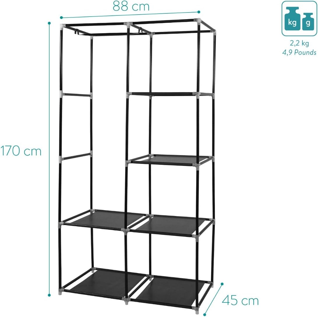 Με διαστάσεις 88 x 170 x 45 cm, αυτή η ντουλάπα προσφέρει αρκετό χώρο για όλα σας τα αντικείμενα, από ρούχα και παπούτσια μέχρι αξεσουάρ και άλλα είδη. Η ενσωματωμένη ράγα ρούχων μπορεί να αντέξει έως και 25 κιλά, ενώ τα ράφια παρέχουν επιπλέον χώρο για να οργανώσετε με άνεση τα αγαπημένα σας ρούχα και αξεσουάρ.