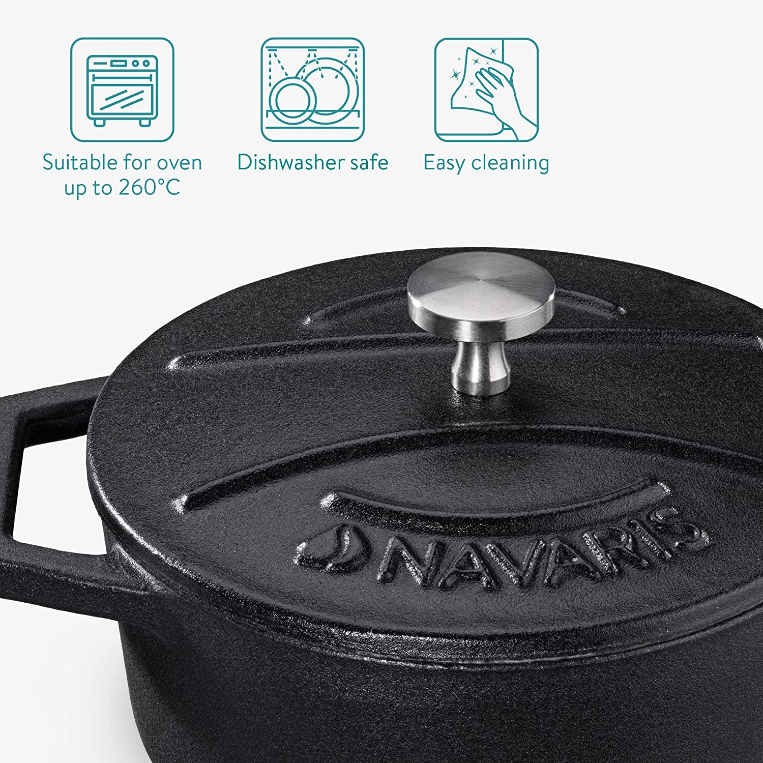 Τόσο η κατσαρόλα όσο και το καπάκι είναι κατάλληλα για φούρνο έως 260 βαθμούς Κελσίου. Το φινίρισμα από σμάλτο αποτρέπει το φαγητό να κολλήσει και διευκολύνει τον καθαρισμό του, μπορεί να πλυθεί στο χέρι ή στο πλυντήριο πιάτων.