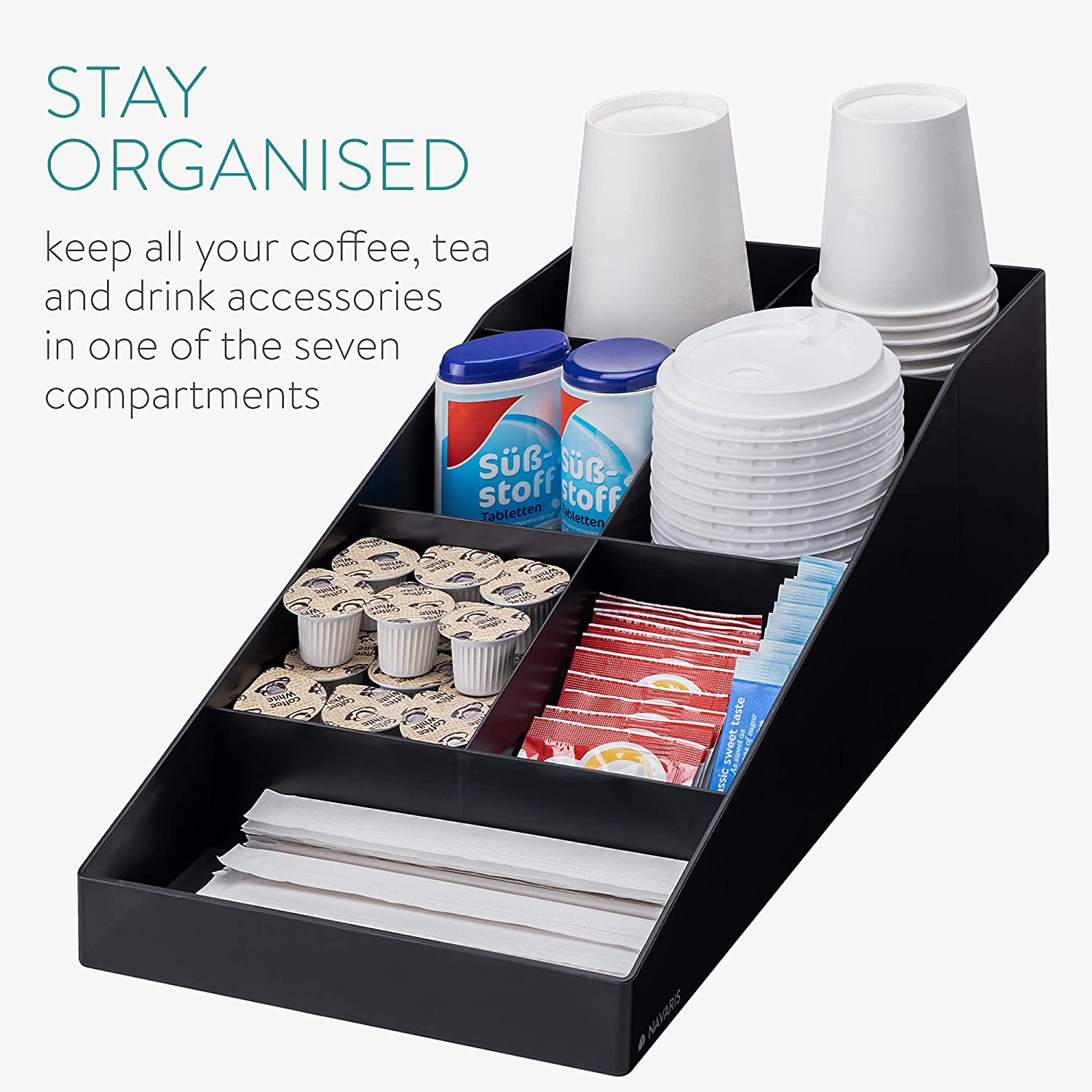 Χάρη στα 7 διαφορετικά διαμερίσματα, μπορείτε να ταξινομήσετε γρήγορα όλα τα σημαντικά συστατικά ενός καλού καφέ. Μπορούν επίσης να αποθηκευτούν αξεσουάρ για τσάι ή ζεστή σοκολάτα, ενώ διαθέτει εύκολη εγκατάσταση καθώς δεν απαιτείται συναρμολόγηση.
