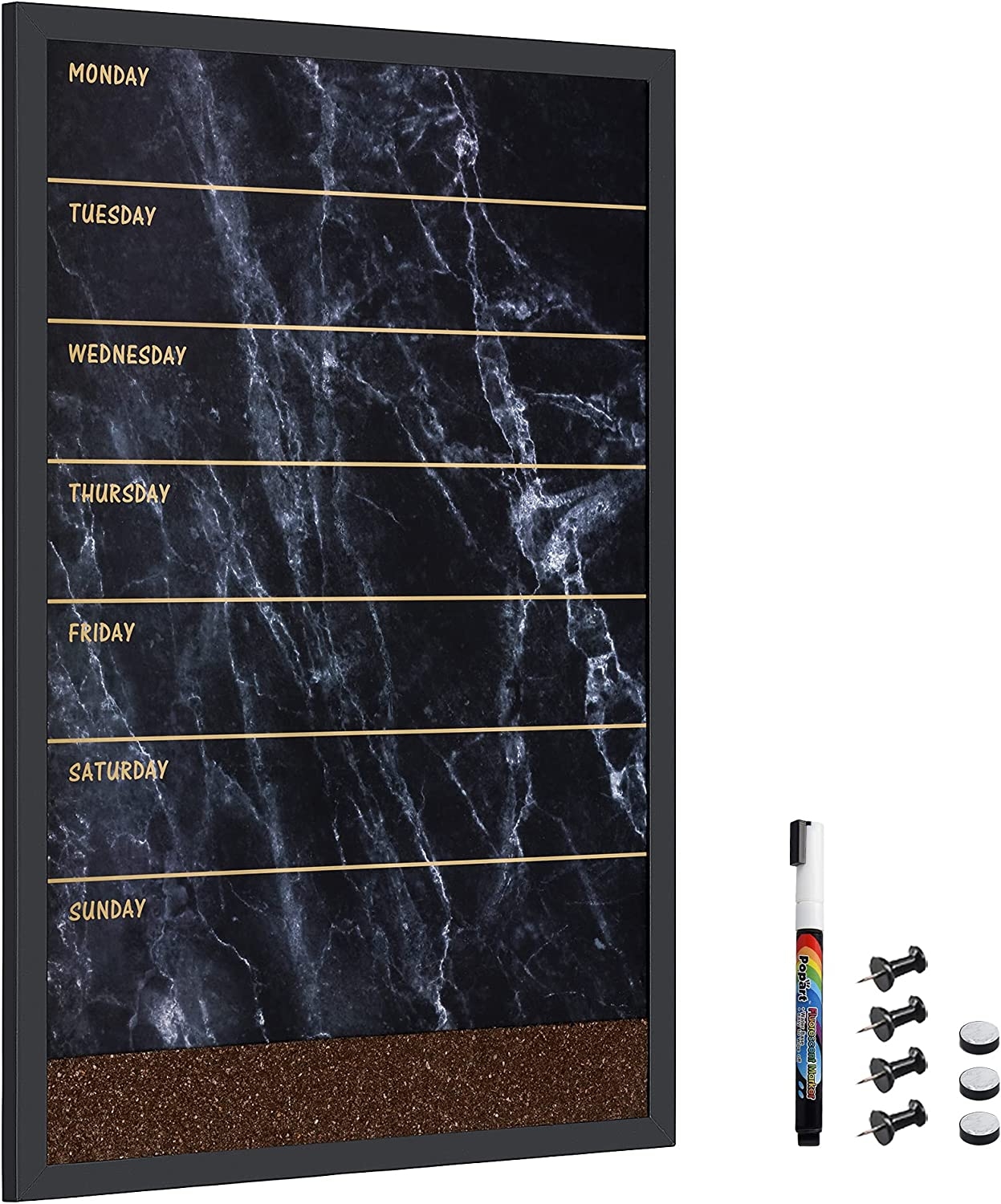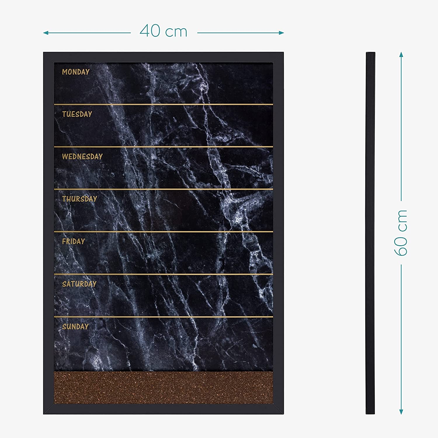 Οργανώστε την καθημερινότητά σας με τον συνδυαστικό εβδομαδιαίο πίνακα ανακοινώσεων, με μαγνητικό πίνακα και πίνακα από φελλό της Navaris. Επισυνάψτε τις σημειώσεις σας με τις πινέζες στο φελλό, γράψτε ή χρησιμοποιήστε μαγνήτες για να στερεώσετε χαρτιά στη μαγνητική επιφάνεια.