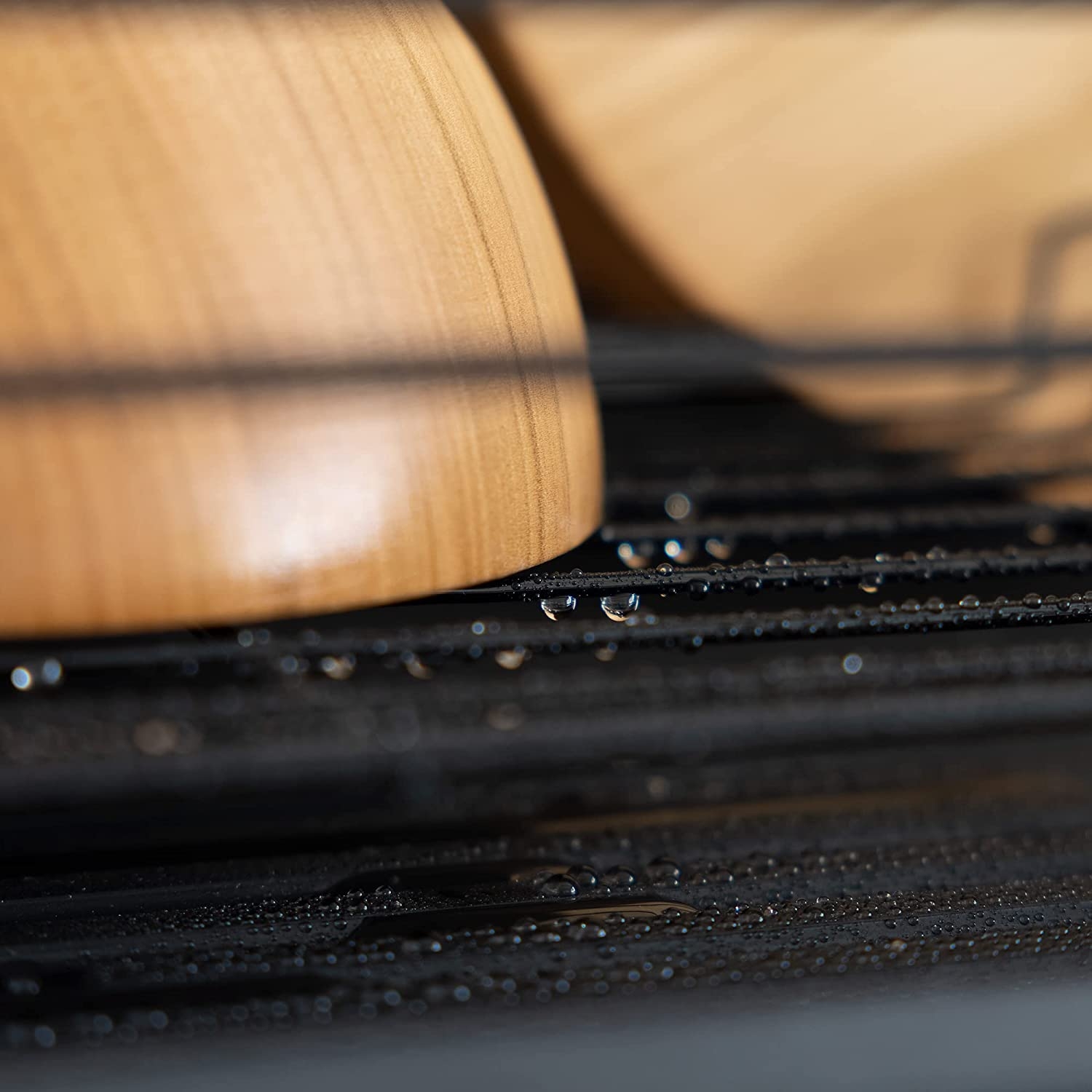 Με ξύλινες λαβές που όχι μόνο φαίνονται υπέροχες, αλλά διασφαλίζουν επίσης ότι μπορείτε να μεταφέρετε εύκολα την πιατοθήκη. Διαθέτει πλαστικό δίσκο για αποστράγγιση και αφαιρούμενη θήκη μαχαιροπήρουνων.