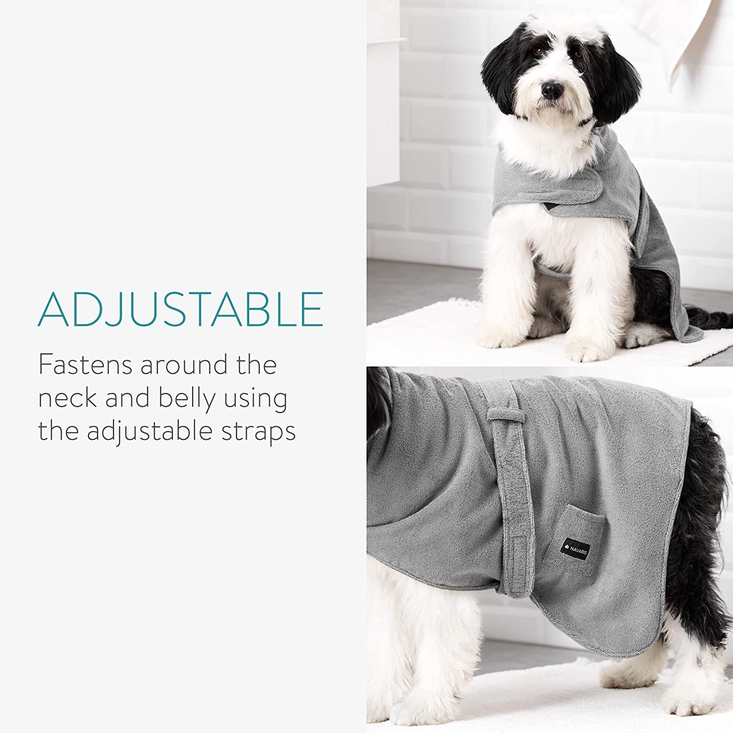 Η πετσέτα διαθέτει ρυθμιζόμενους ιμάντες για να προσαρμόζεται ανάλογα με το μέγεθος του σκύλου σας και βοηθούν στο να παραμείνει το μπουρνούζι στη θέση του ακόμα και στα πιο ζωηρά σκυλιά. Ένα αξεσουάρ ιδιαίτερα άνετο για τον τετράποδο φίλο σας!