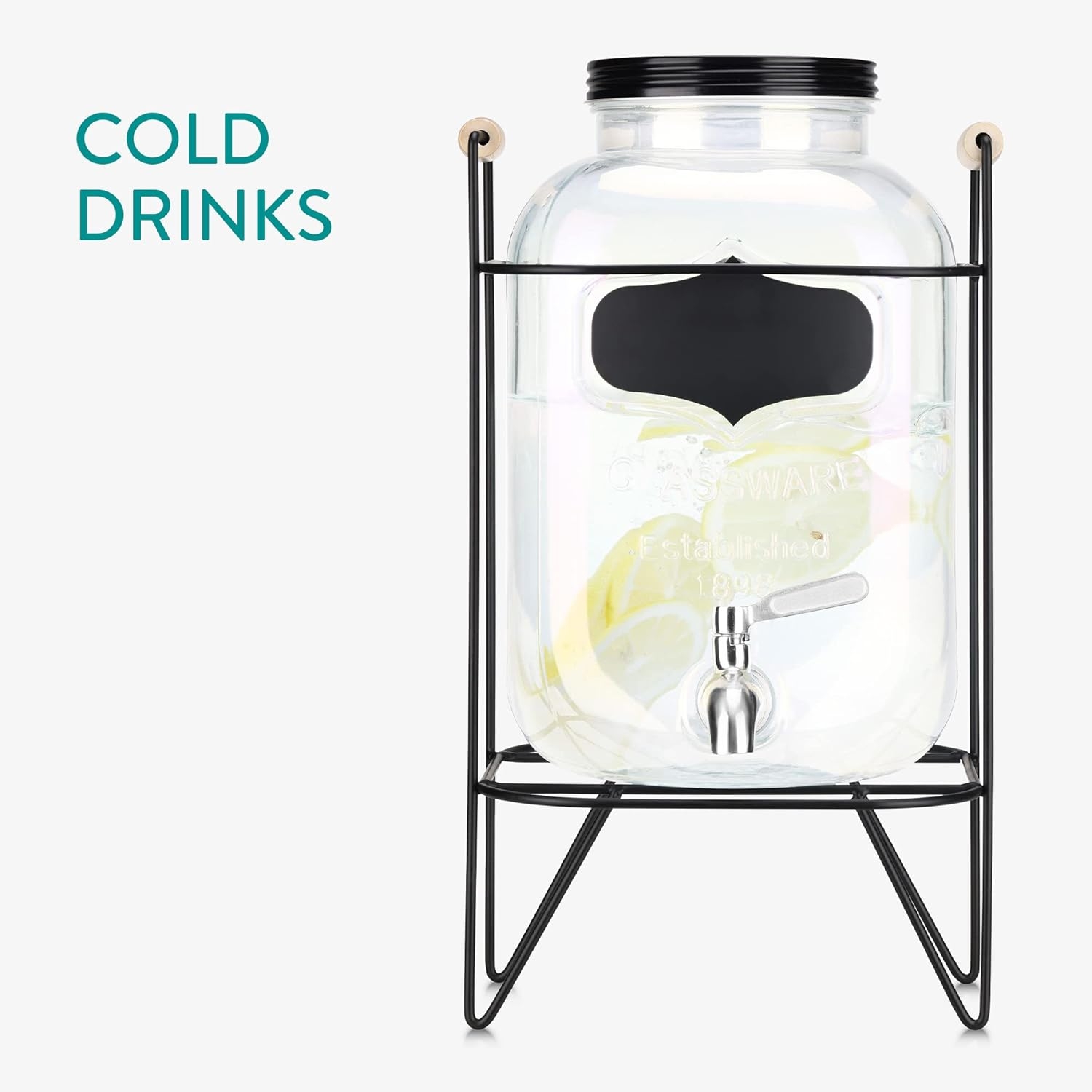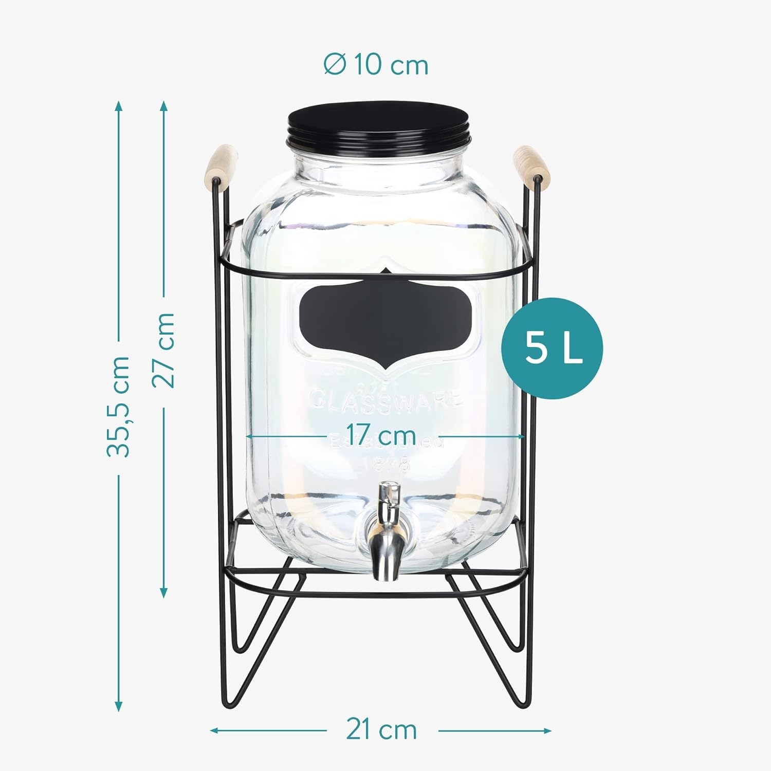 Προσφέρετε νόστιμη λεμονάδα, χυμό, σόδα, παγωμένο τσάι ή ζεστά ροφήματα με τον κομψό διανεμητή ποτών της Navaris. Με το υψηλής ποιότητας γυάλινο δοχείο με βρύση από ανοξείδωτο ατσάλι, στήριγμα από μέταλλο και λαβές από ξύλο, διοργανώστε το επόμενο πάρτι και εντυπωσιάστε!