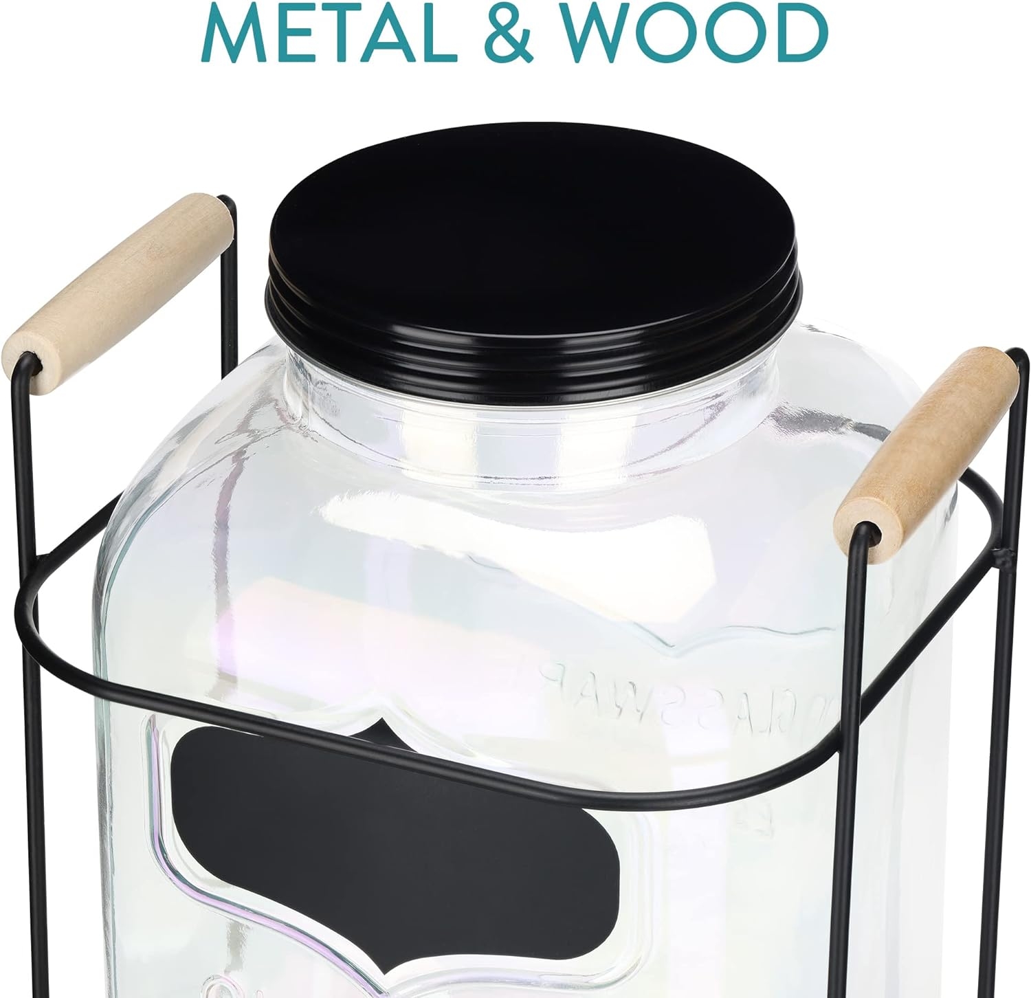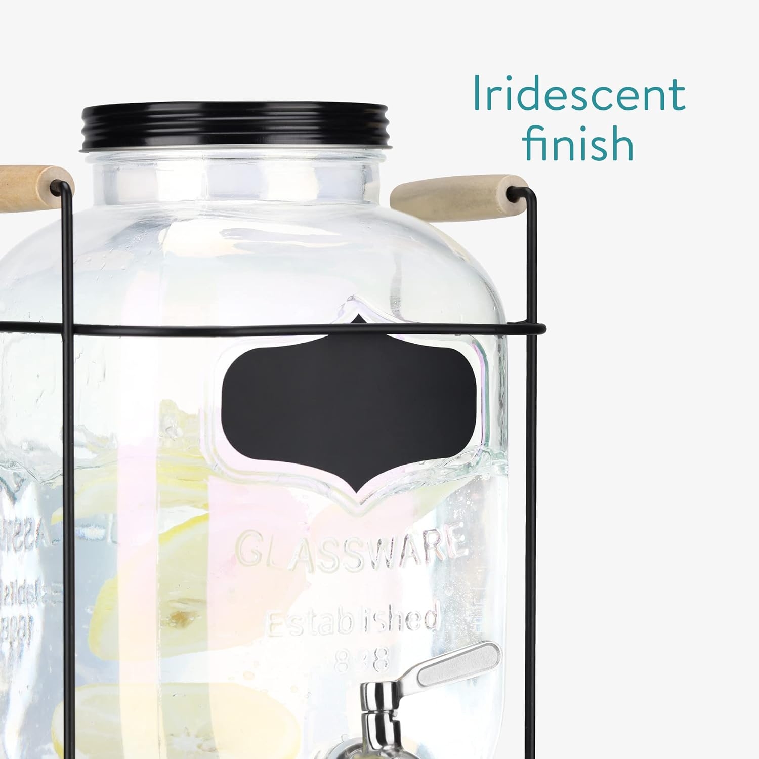 Navaris Drinks Dispenser with Tap and Stand - Γυάλινος Διανεμητής Ποτού με Βάση από Μέταλλο και Λαβές από Ξύλο - 5L - Clear / Rainbow Glass Effect (51378.03)