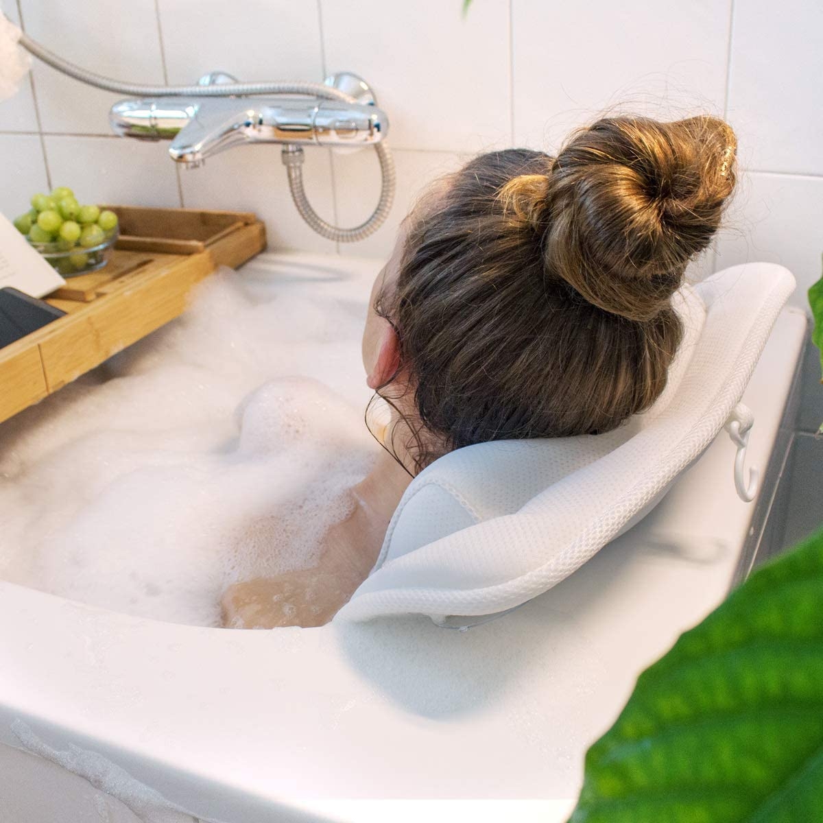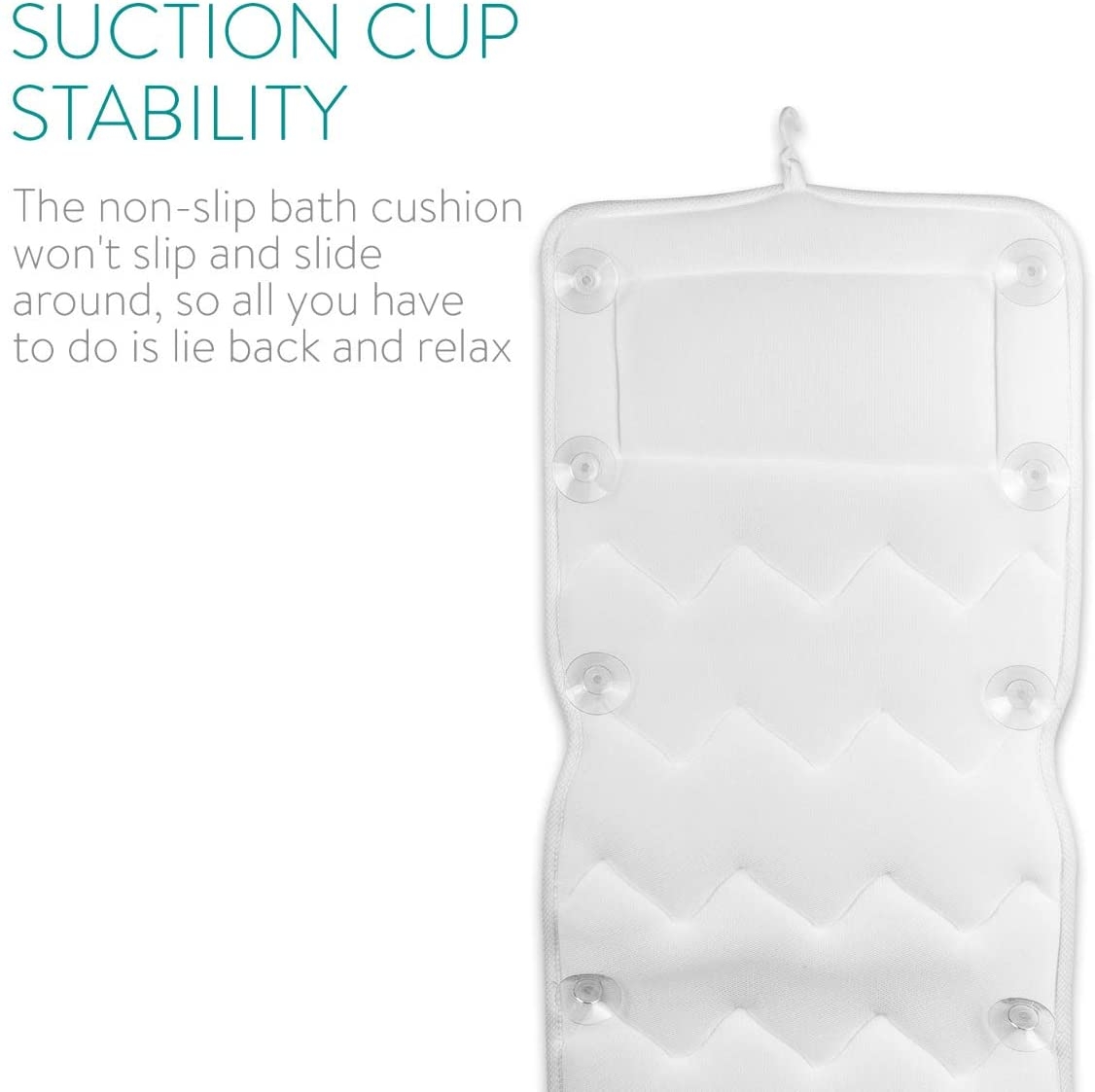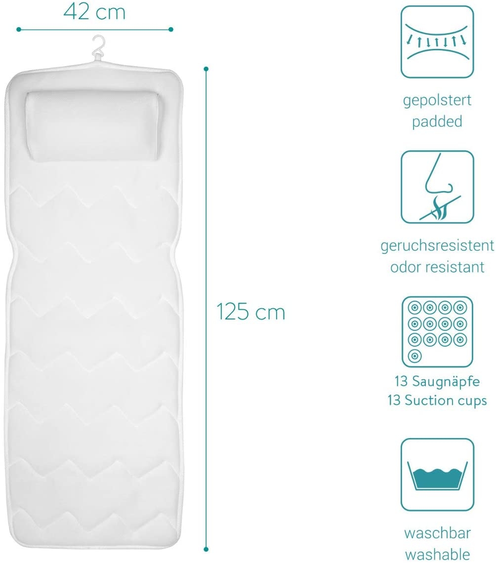 Διαθέτει 13 ισχυρές βεντούζες οι οποίες κρατούν το μαξιλάρι σώματος σταθερό, διασφαλίζοντας ότι δεν θα γλιστρήσετε στην μπανιέρα. Χάρη στον εργονομικό σχεδιασμό του, το κεφάλι και ο λαιμός υποστηρίζονται ιδανικά στο ενσωματωμένο μαξιλάρι κεφαλής. Το ιδανικό δώρο μπάνιου για όποιον θέλει να  απολαμβάνει την άνεση και τη χαλάρωση.