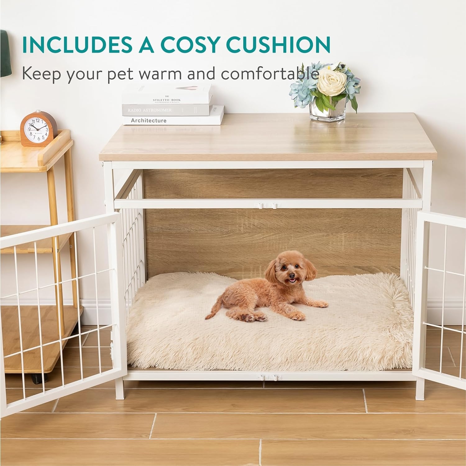 Είναι κατασκευασμένο από κόντρα πλακέ λεύκα στην πάνω επιφάνεια του επίπλου και από σιδερένιο πλαίσιο και ένα πλαστικό χαλάκι, αυτό το κλουβί για σκύλους προσφέρει ένα μείγμα ανθεκτικότητας και σταθερότητας. Με τις οδηγίες εγκατάστασης που περιλαμβάνονται, η συναρμολόγηση είναι πολύ εύκολη, με αυτόν τον τρόπο μπορείτε να δημιουργήσετε γρήγορα ένα άνετο και ασφαλές μέρος για τον σκύλο σας.