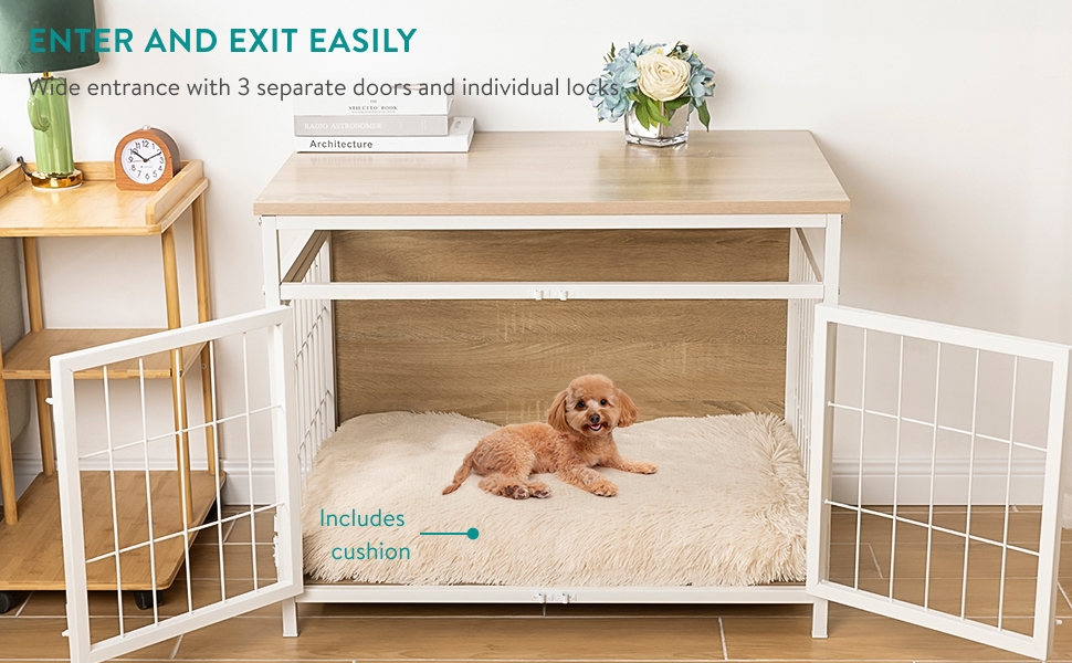 Αυτό το όμορφο έπιπλο με φρέσκο λευκό χρώμα και μπεζ επιτραπέζιο πάγκο φαίνεται όμορφο σχεδόν σε κάθε εσωτερικό χώρο και έχει ήρεμα χρώματα. Με τις 3 ξεχωριστές πόρτες και τις ατομικές κλειδαριές, αυτό το έπιπλο για σκύλους προσφέρει στο κατοικίδιό σας ένα ασφαλές και άνετο μέρος.