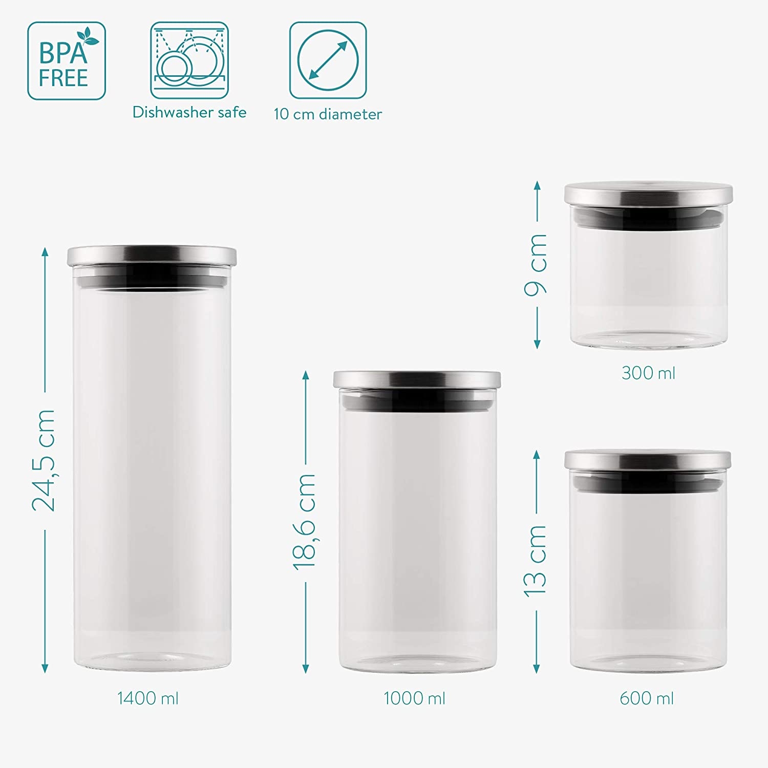 Τα καπάκια από ανοξείδωτο ατσάλι είναι αεροστεγή ώστε να διατηρούνται τα τρόφιμα φρέσκα για μεγαλύτερο χρονικό διάστημα. Τα γυάλινα βάζα έχουν χωρητικότητα 1 x 1400 ml, 1 x 1000 ml, 1 x 600 ml και 1 x 300 ml, προσφέροντάς σας αρκετό χώρο.