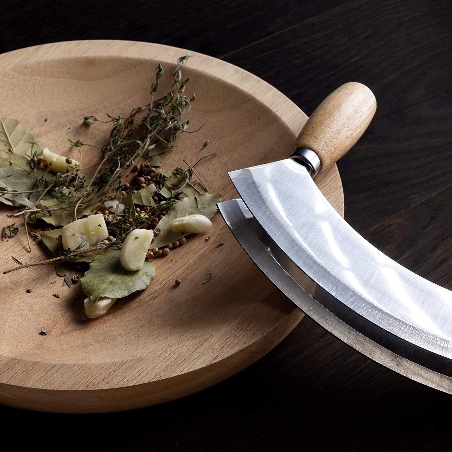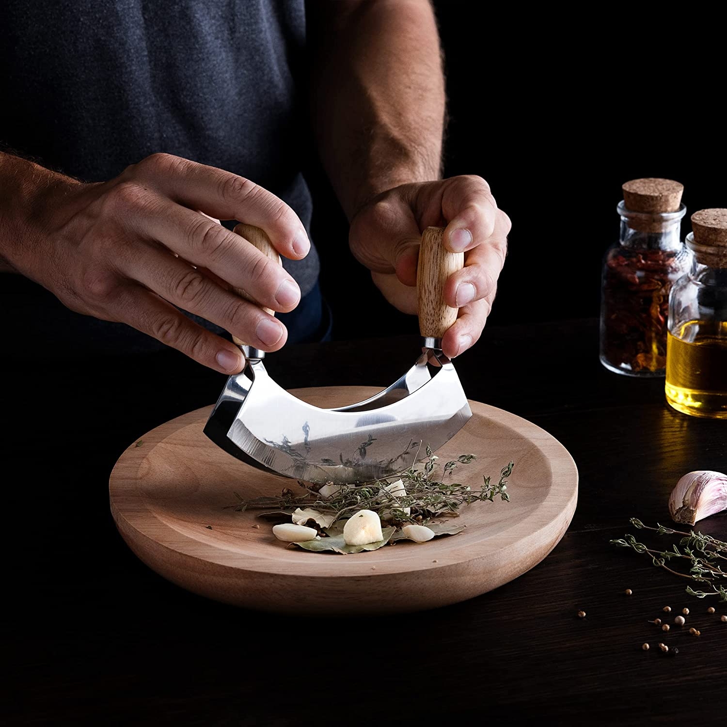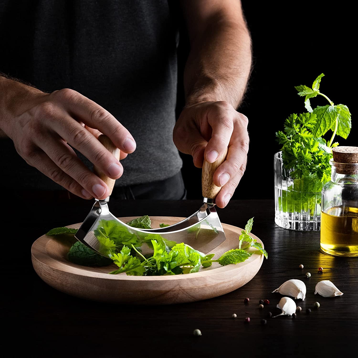 Χρησιμοποιήστε τη διπλή λεπίδα του μαχαιριού για να ψιλοκόψετε φρέσκα μυρωδικά, σκόρδο, κρεμμύδια, λαχανικά, αποξηραμένα φρούτα, μπαχαρικά κ.λπ. Ετοιμάστε νόστιμα γεύματα και προσθέστε γεύσεις και αρώματα!