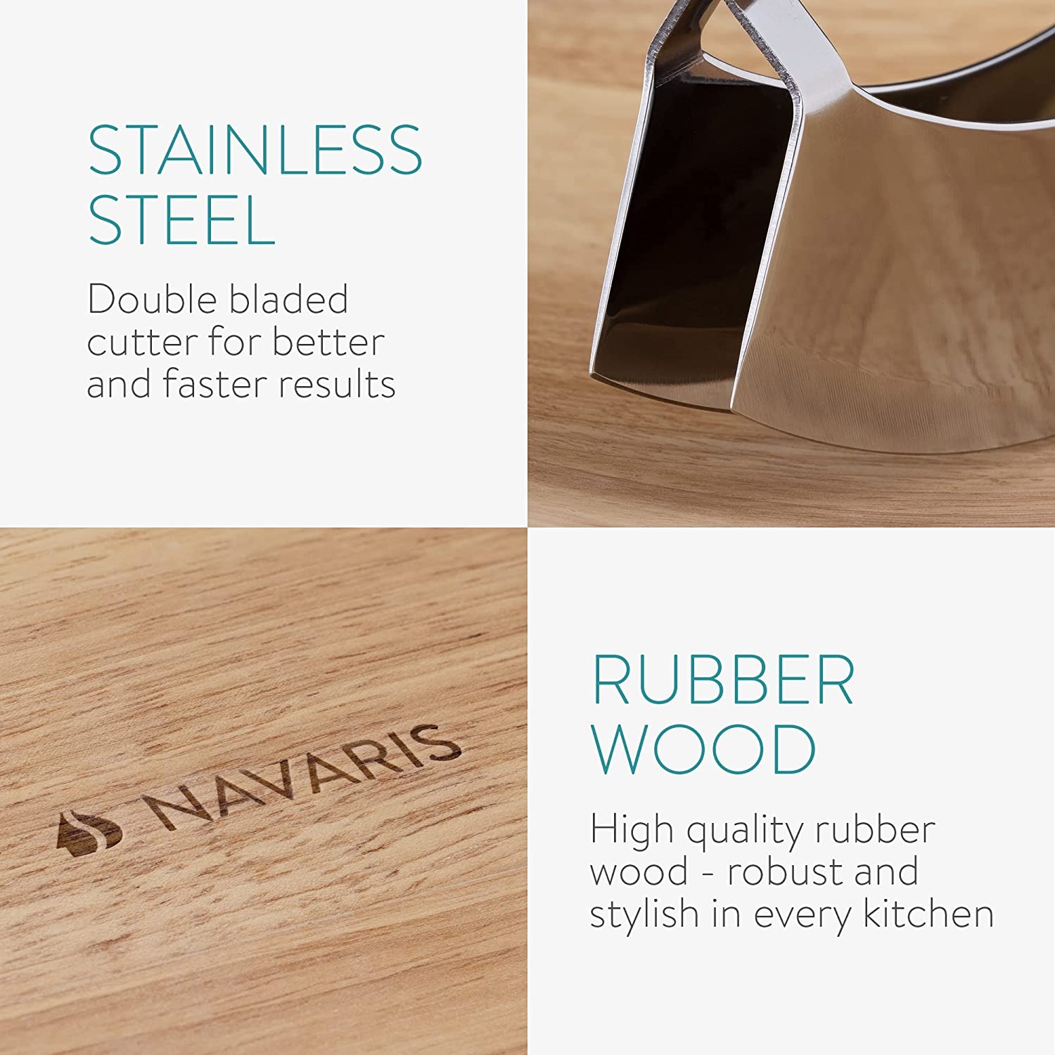 Οι δύο στρογγυλεμένες λαβές του μαχαιριού παρέχουν περισσότερη άνεση και σταθερότητα. Η επιφάνεια κοπής και οι λαβές του μαχαιριού είναι κατασκευασμένες από ξύλο καουτσούκ, ένα υλικό φυσικό και οικολογικό υλικό. Οι δύο λεπίδες του μαχαιριού είναι κατασκευασμένες από ανθεκτικό ανοξείδωτο ατσάλι.