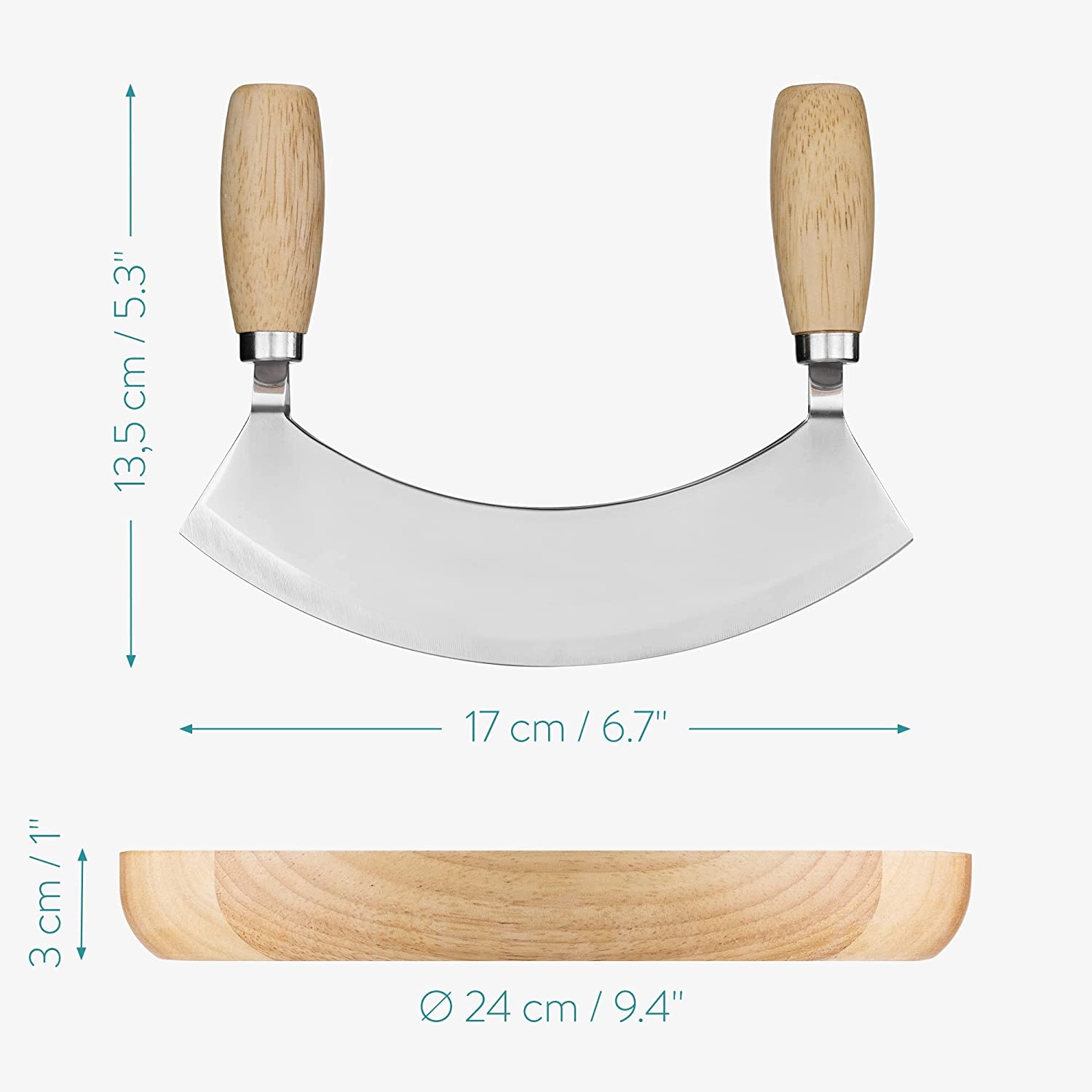 Εξοπλίστε την κουζίνα σας με αυτό το πρακτικό σετ που αποτελείται από μαχαίρι mezzaluna και ξύλινη επιφάνεια κοπής της Navaris. Τα μπαχαρικά, τα βότανα, οι ξηροί καρποί και η σαλάτα σας τώρα μπορούν να ψιλοκοπούν γρήγορα και εύκολα.