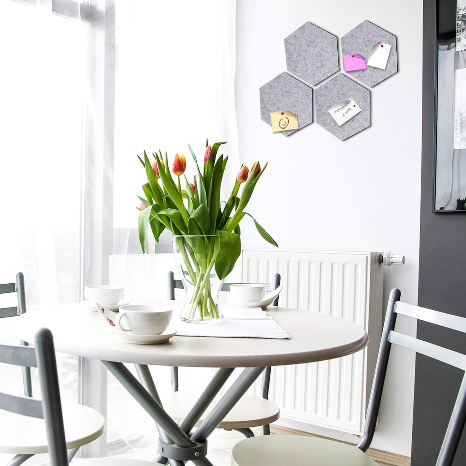 Είναι επίσης ιδανικές ως διακόσμηση στο σπίτι σας. Η συσκευασία περιέχει 4 εξάγωνα πλαίσια ανακοινώσεων από τσόχα με διαστάσεις 20 x 17 x 1,5 cm, 12 τεμάχια κολλητικής ταινίας και 10 κόκκινες καρφίτσες. Είναι επίσης κατάλληλα για τα παιδιά που μαθαίνουν τα σχήματα.