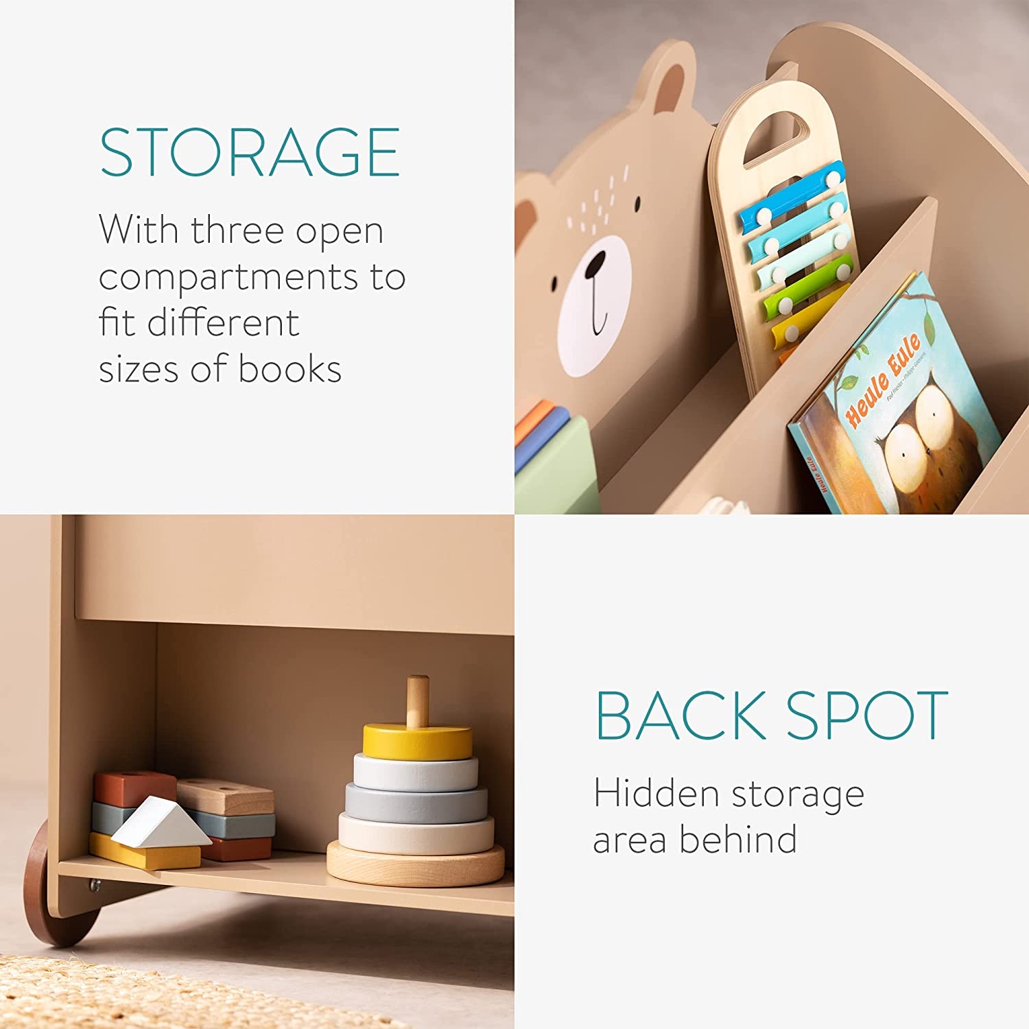 Navaris Kids Bookshelf - Παιδικό Κουτί Αποθήκευσης / Βιβλιοθήκη / Ράφια με 3 Διαμερίσματα και Ρόδες - 60 x 58 x 40 cm - Brown / Bear Design (55858.02)