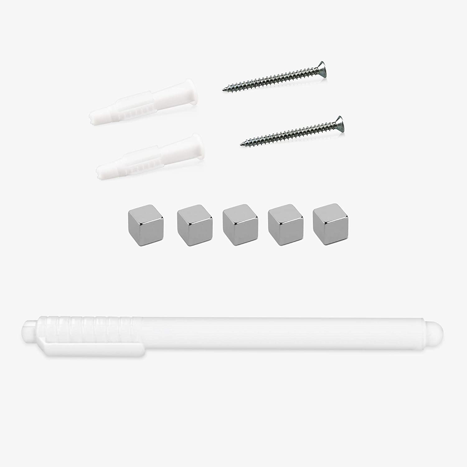 Η συσκευασία περιλαμβάνει: 1x μαγνητικός πίνακας ανακοινώσεων, 1x μαρκαδόρος, 5x μαγνήτες, Σετ εξαρτημάτων για τοποθέτηση σε τοίχο (θα χρειαστείτε τρυπάνι).