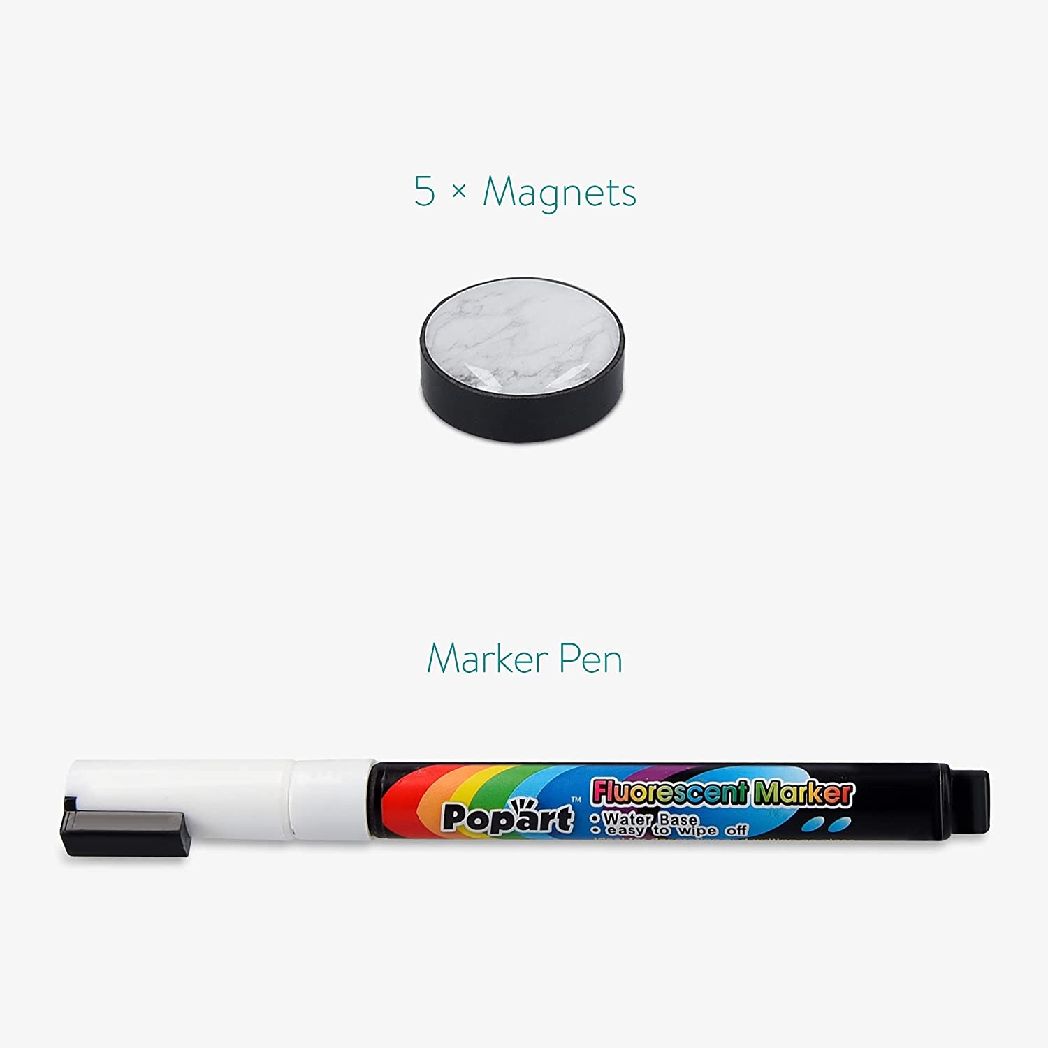 Η συσκευασία περιλαμβάνει: 1x μαγνητικός πίνακας ανακοινώσεων, 1x μαρκαδόρος, 5x μαγνήτες.