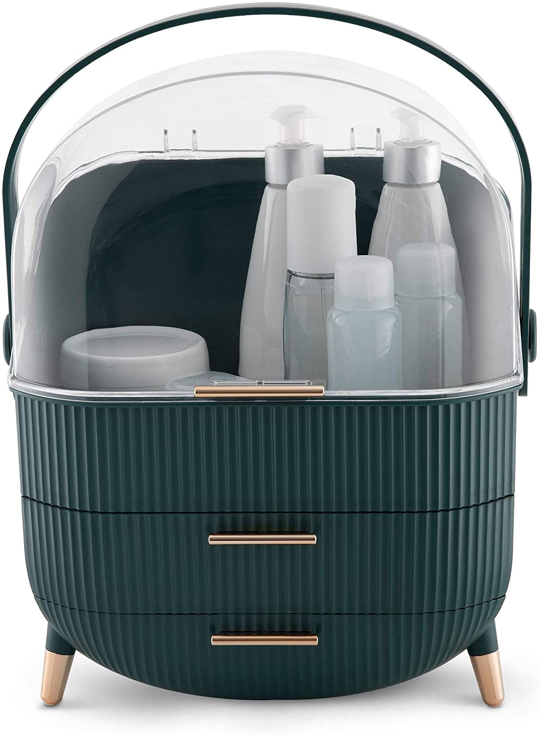 Ο διαφανής θόλος και τα δύο συρτάρια παρέχουν τον απαραίτητο αποθηκευτικό χώρο και μια τέλεια επισκόπηση των αντικειμένων σας, ώστε να βρείτε αυτό που χρειάζεστε γρήγορα και εύκολα! Με αυτό μπορείτε να αποθηκεύσετε πολλά από τα αγαπημένα σας καλλυντικά και να είστε πάντα οργανωμένοι!