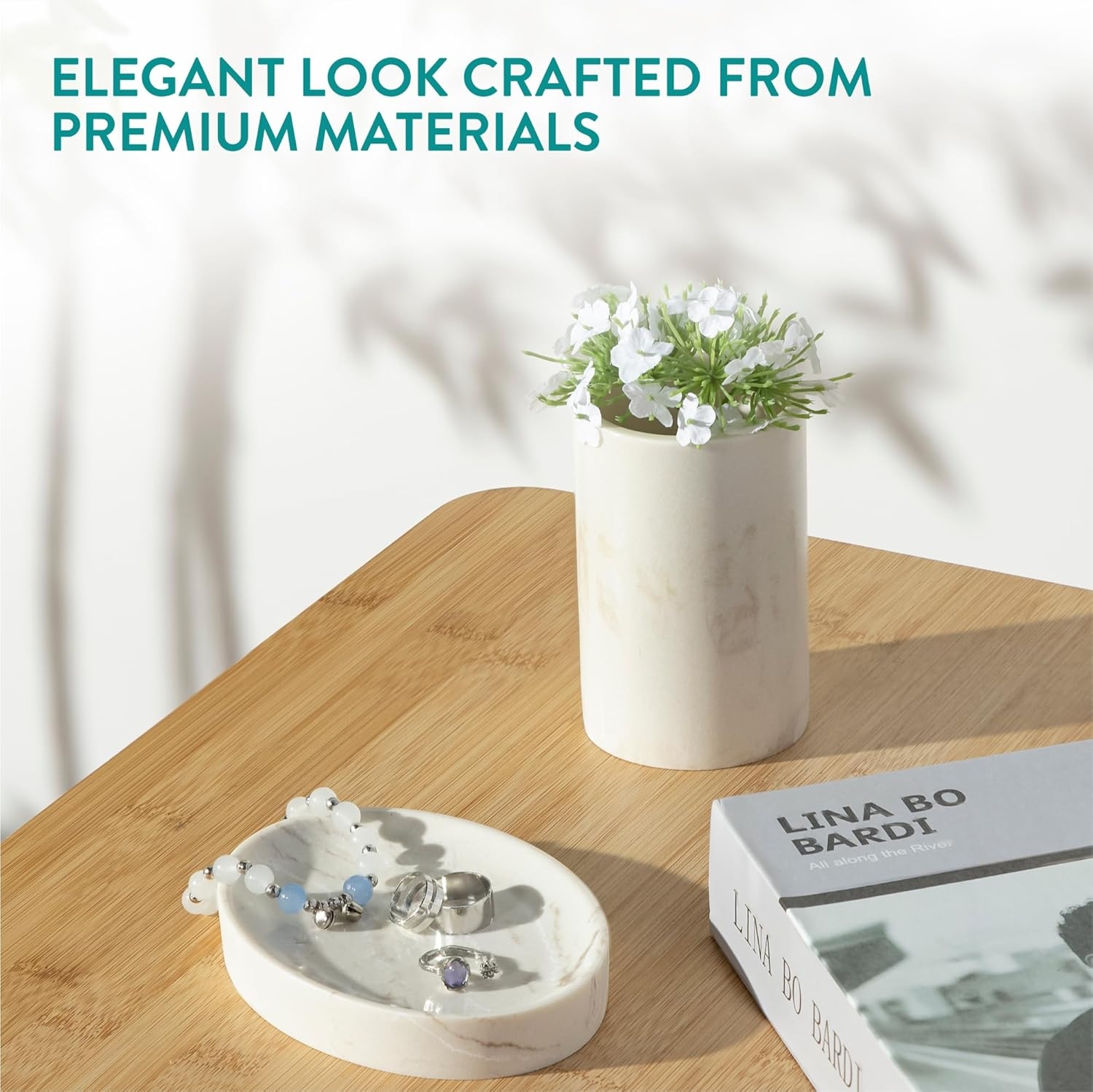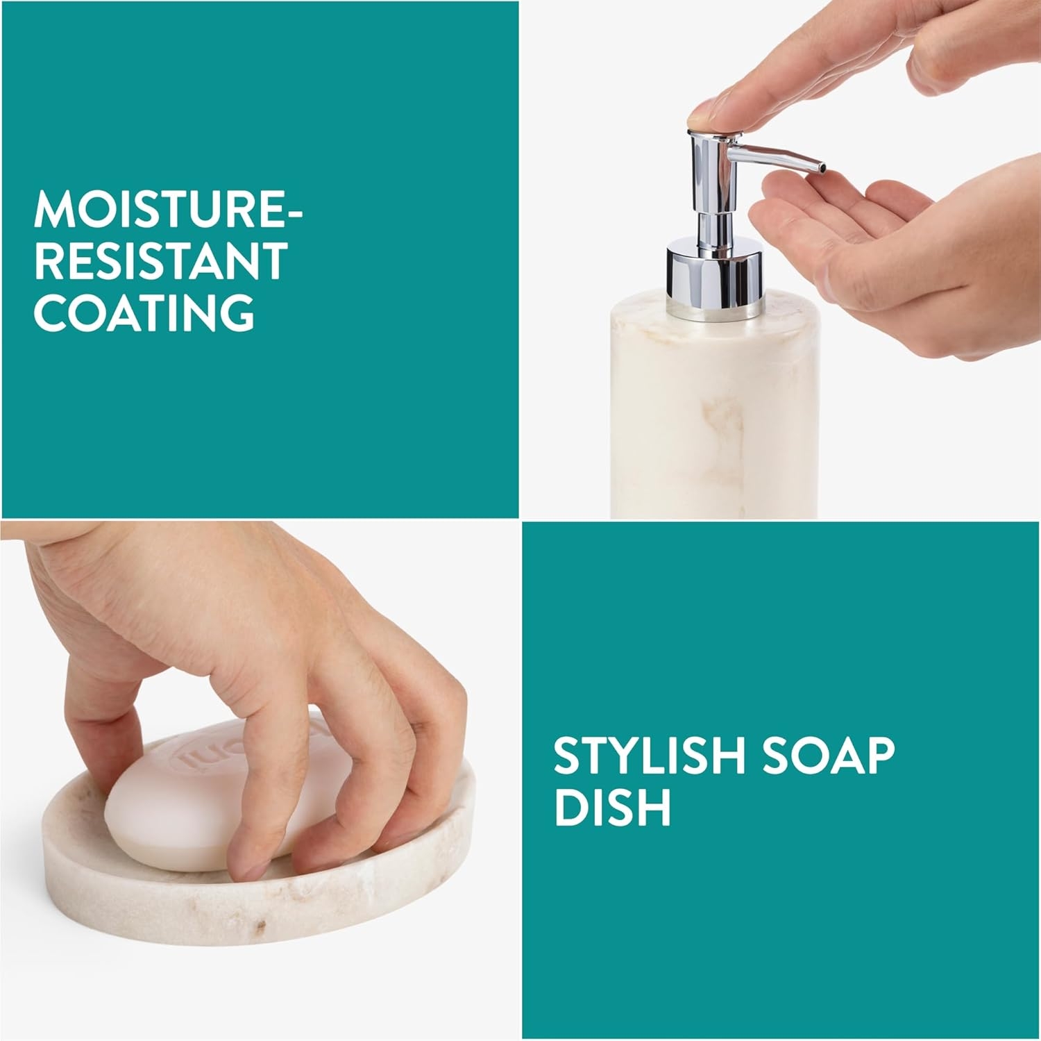 Η εντυπωσιακή μπεζ μαρμάρινη όψη προσθέτει μια αίσθηση φυσικής νότας και μοντέρνου στυλ, κάνοντάς τα ιδανικά για κάθε μπάνιο. Το σετ συνδυάζει την όμορφη αισθητική με την πρακτικότητα, ενώ η επιφάνεια τους είναι εξαιρετικά ανθεκτική στο νερό και στο πέρασμα του χρόνου, αποφεύγοντας τη φθορά ή τη συντήρησή τους.