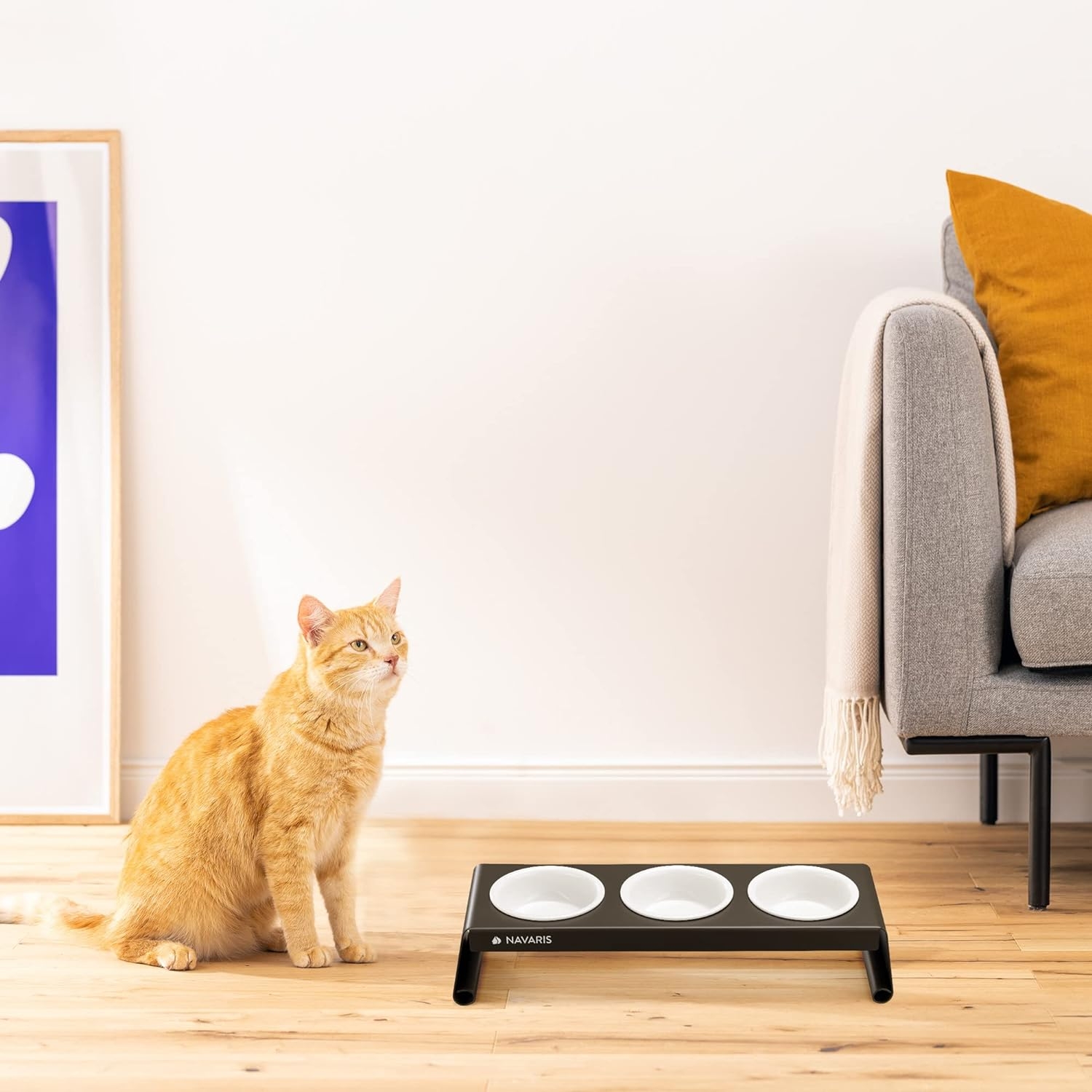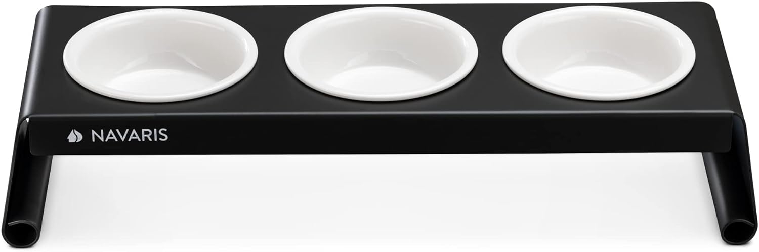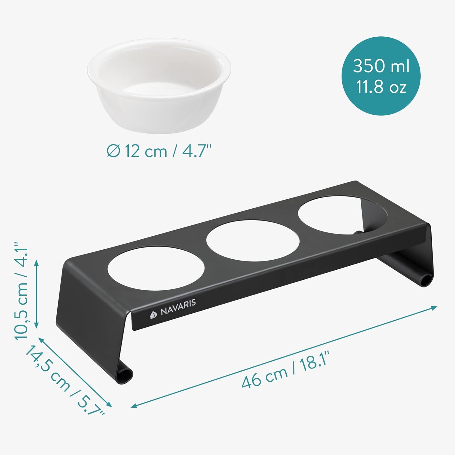 Ταΐστε το αγαπημένο σας χνουδωτό κατοικίδιο με άνεση αλλά και στυλ, με αυτό το υπέροχο σετ της Navaris από 3 κεραμικά μπολ με μεταλλική βάση. Αυτό το μοναδικό σετ είναι σχεδιασμένο με 3 αφαιρούμενα μπολ, σε μια υπερυψωμένη βάση και είναι κατάλληλο για τροφή και νερό, για μία ή περισσότερες γάτες ή σκύλους.