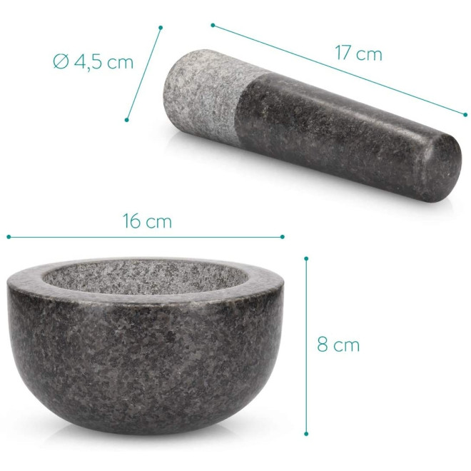 Σημείωση: Το πέτρινο γουδί πρέπει πάντα να καθαρίζεται στο χέρι και χωρίς απορρυπαντικό. Δεν πλένεται στο πλυντήριο πιάτων. Ο γρανίτης είναι ένα φυσικό υλικό, έτσι κάθε σετ είναι μοναδικό.